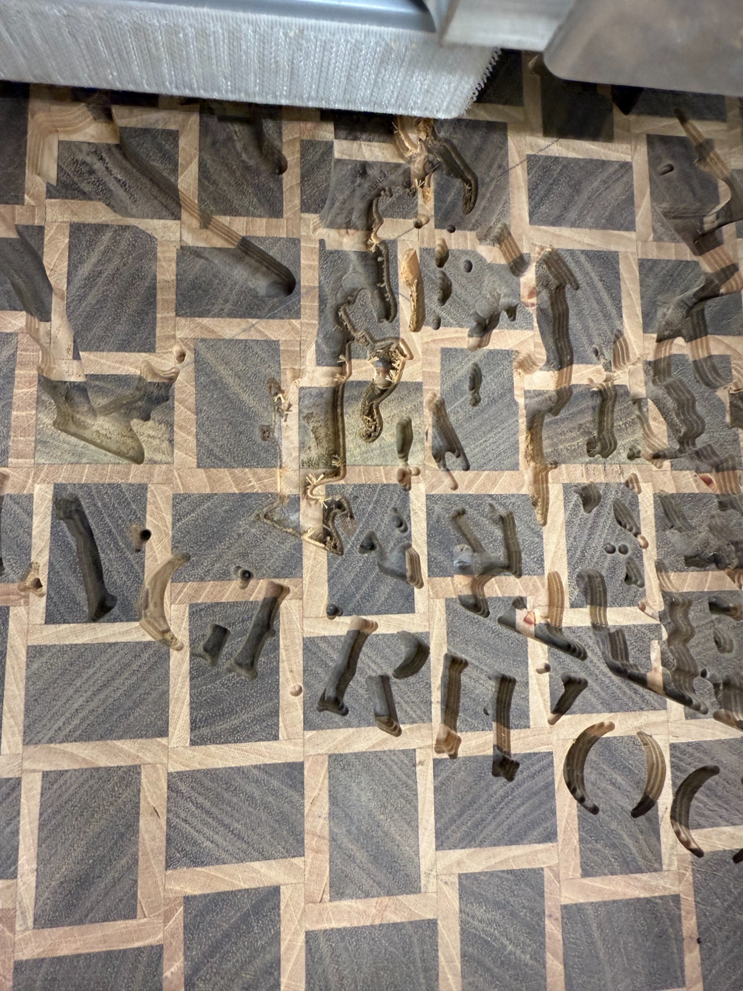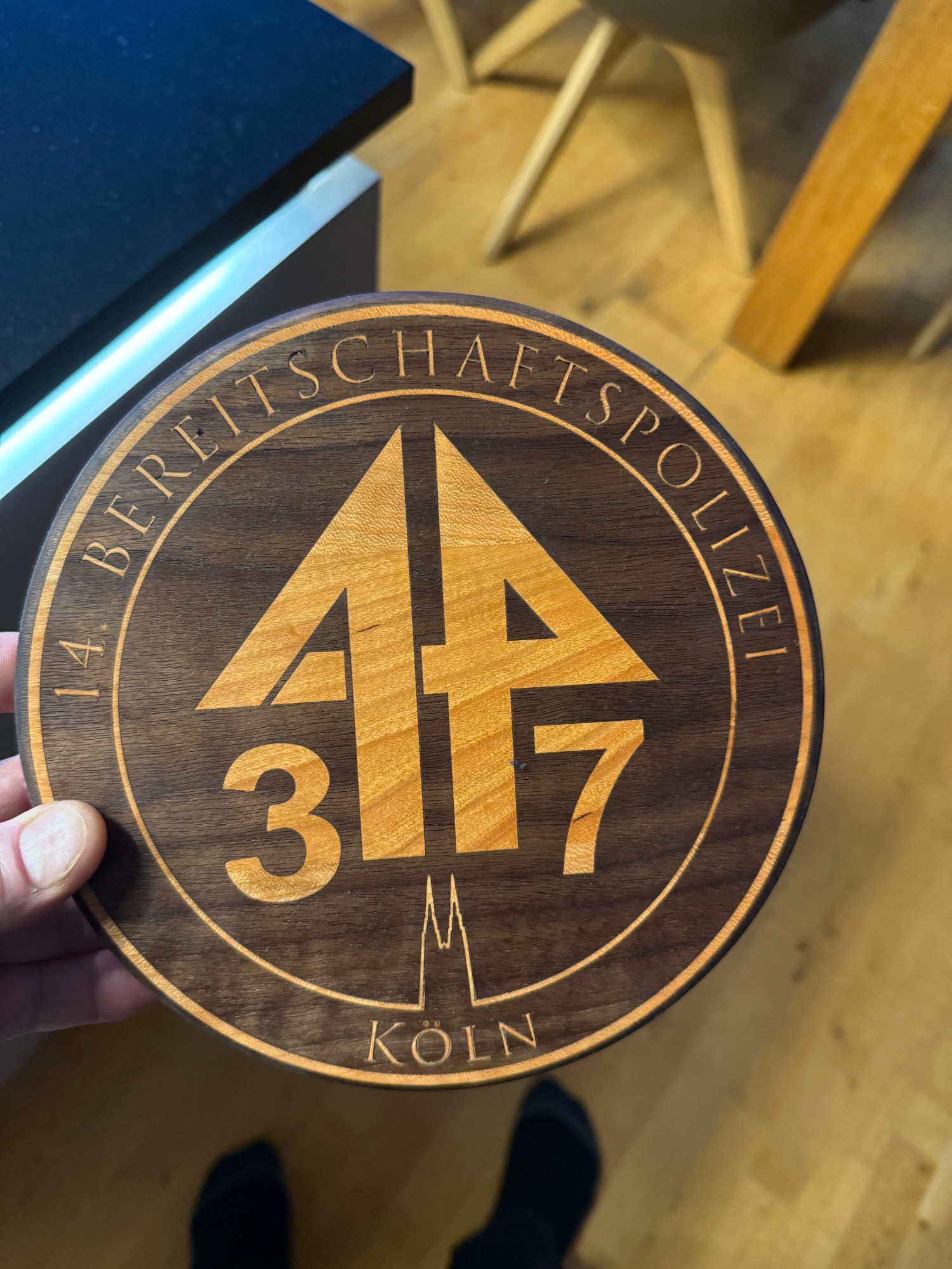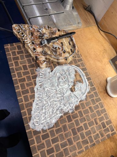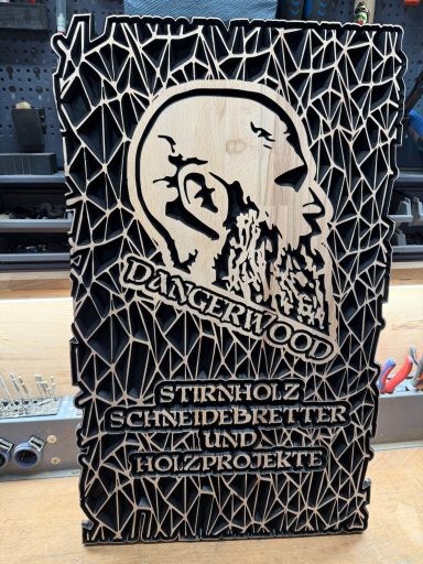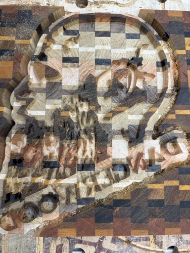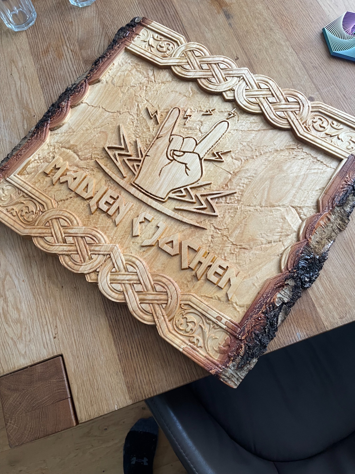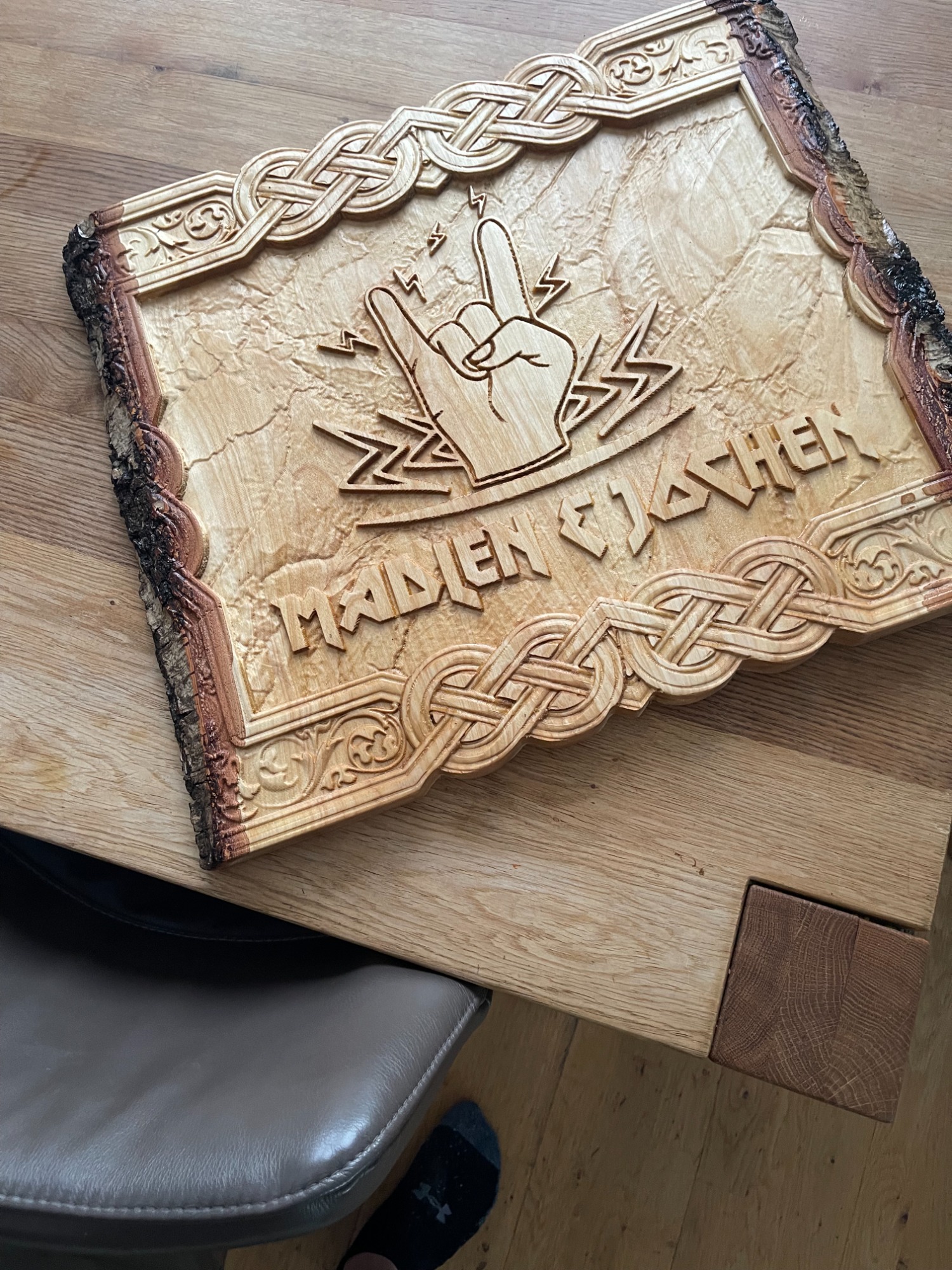 Anschließend wird alles wieder zusammengefügt, verleimt und erneut plan gefräst. Jetzt ist die Lücke zwischen den Puzzleteilen fast nahtlos – ein echter Augenschmaus! Und mein Kopf sprudelt vor Ideen: Was könnte man noch machen? Wikinger mit Äxten? Firmenlogos? Den eigenen Namen? Eine Lebensweisheit (falls es eine gibt)? Das Lieblingsbild (natürlich mit Grenzen)? Und vieles mehr!