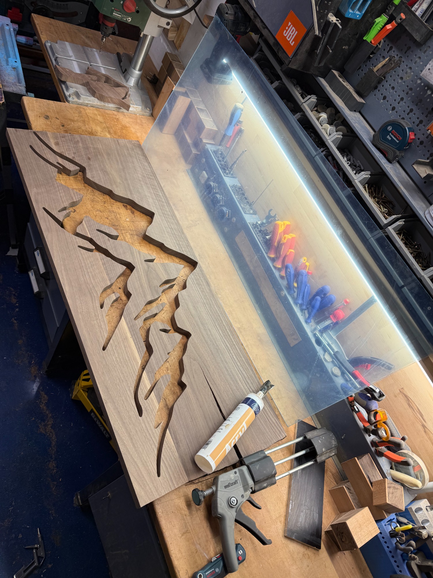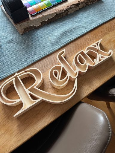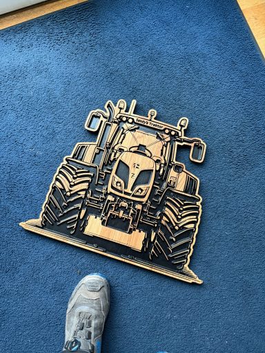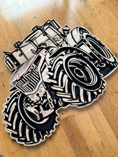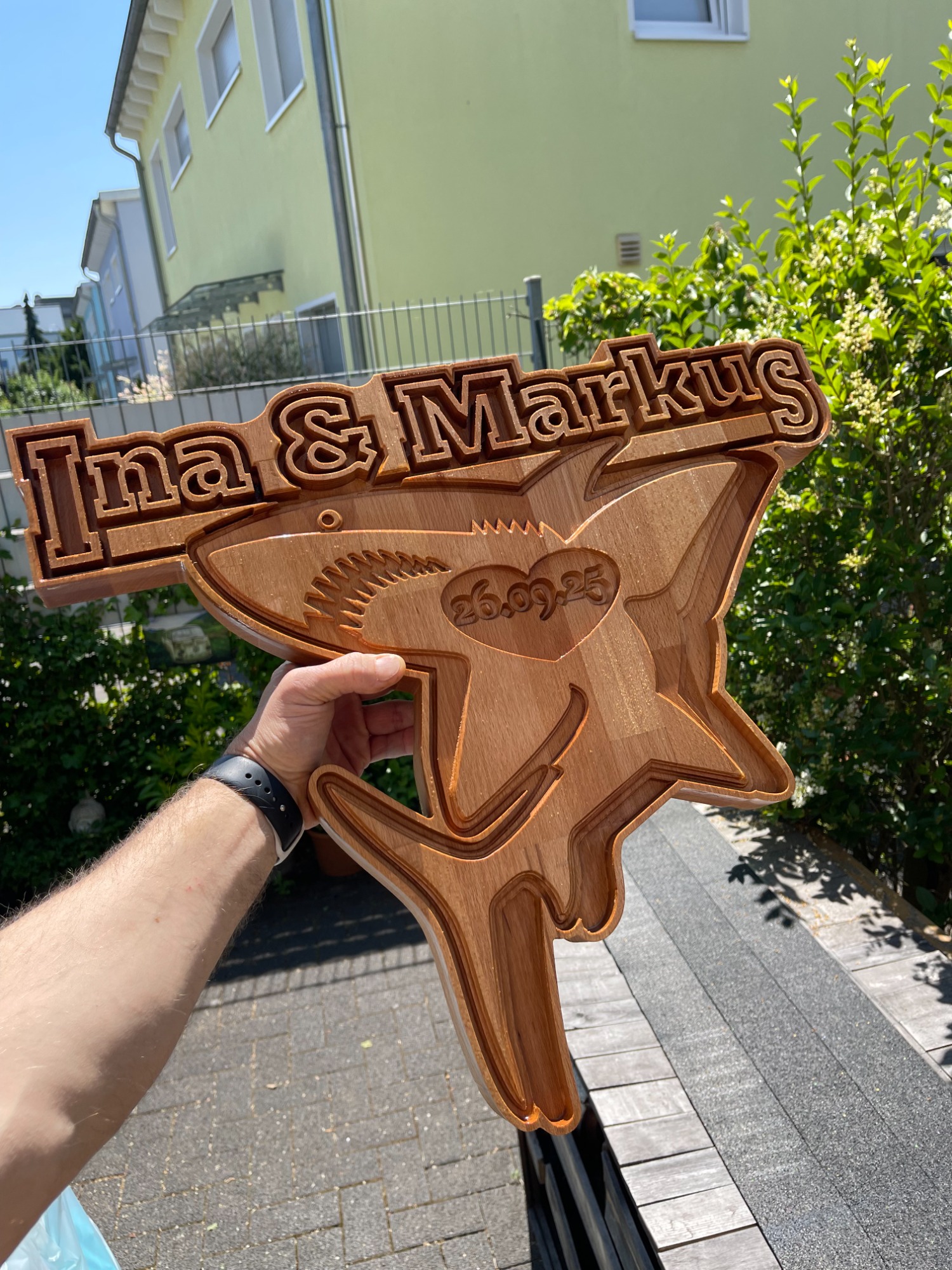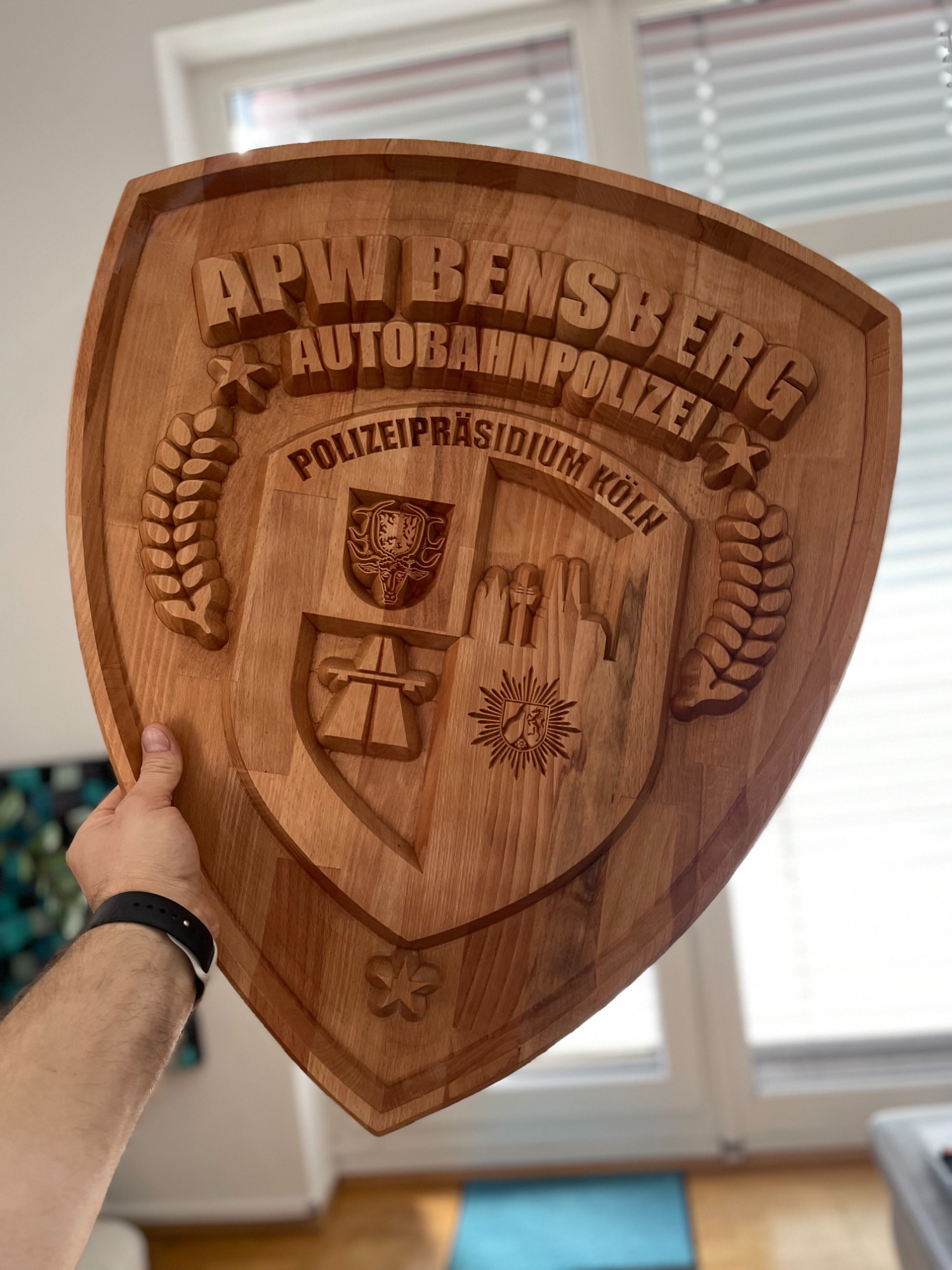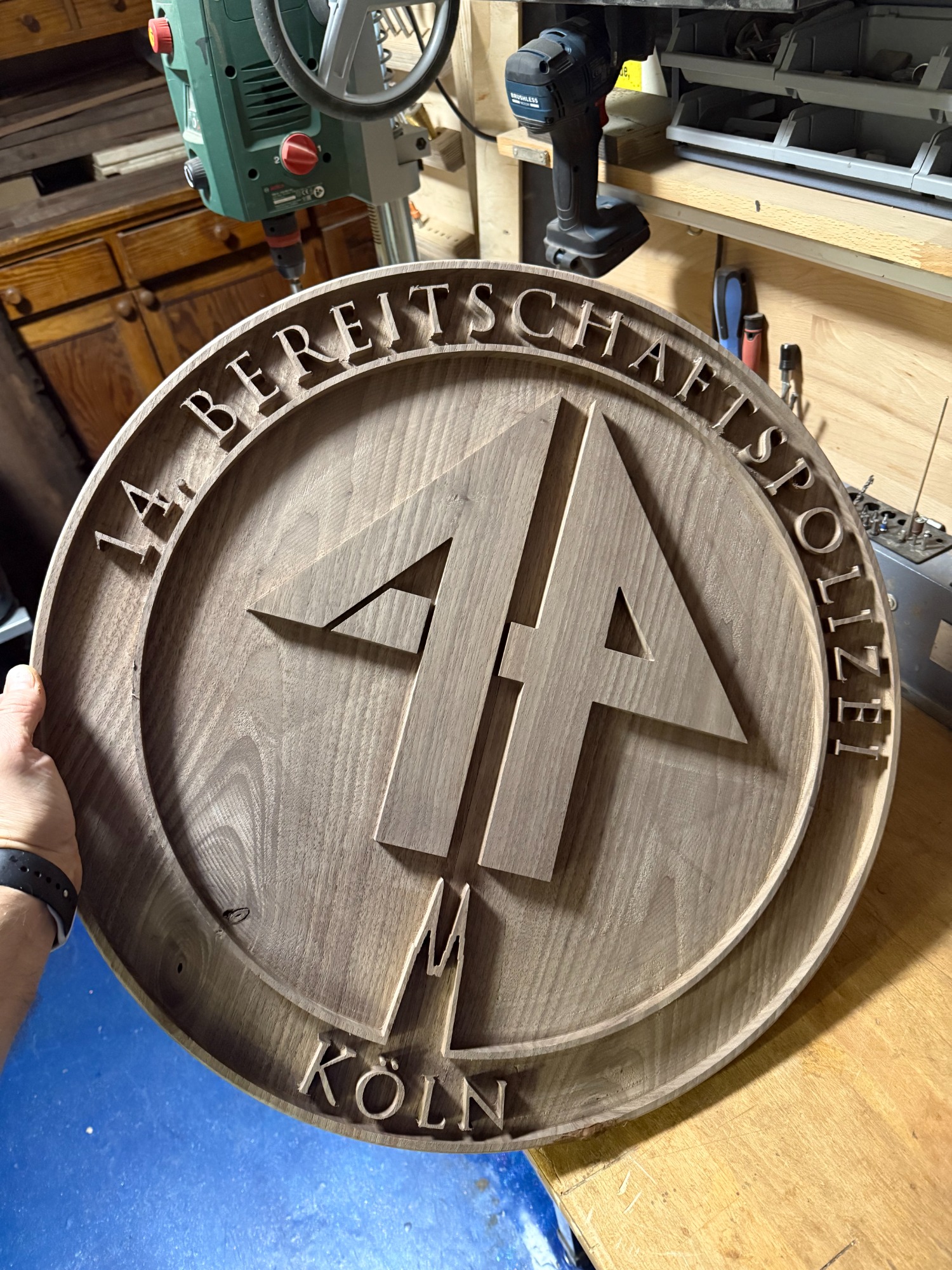 Anschließend wird alles wieder zusammengefügt, verleimt und erneut plan gefräst. Jetzt ist die Lücke zwischen den Puzzleteilen fast nahtlos – ein echter Augenschmaus! Und mein Kopf sprudelt vor Ideen: Was könnte man noch machen? Wikinger mit Äxten? Firmenlogos? Den eigenen Namen? Eine Lebensweisheit (falls es eine gibt)? Das Lieblingsbild (natürlich mit Grenzen)? Und vieles mehr!
