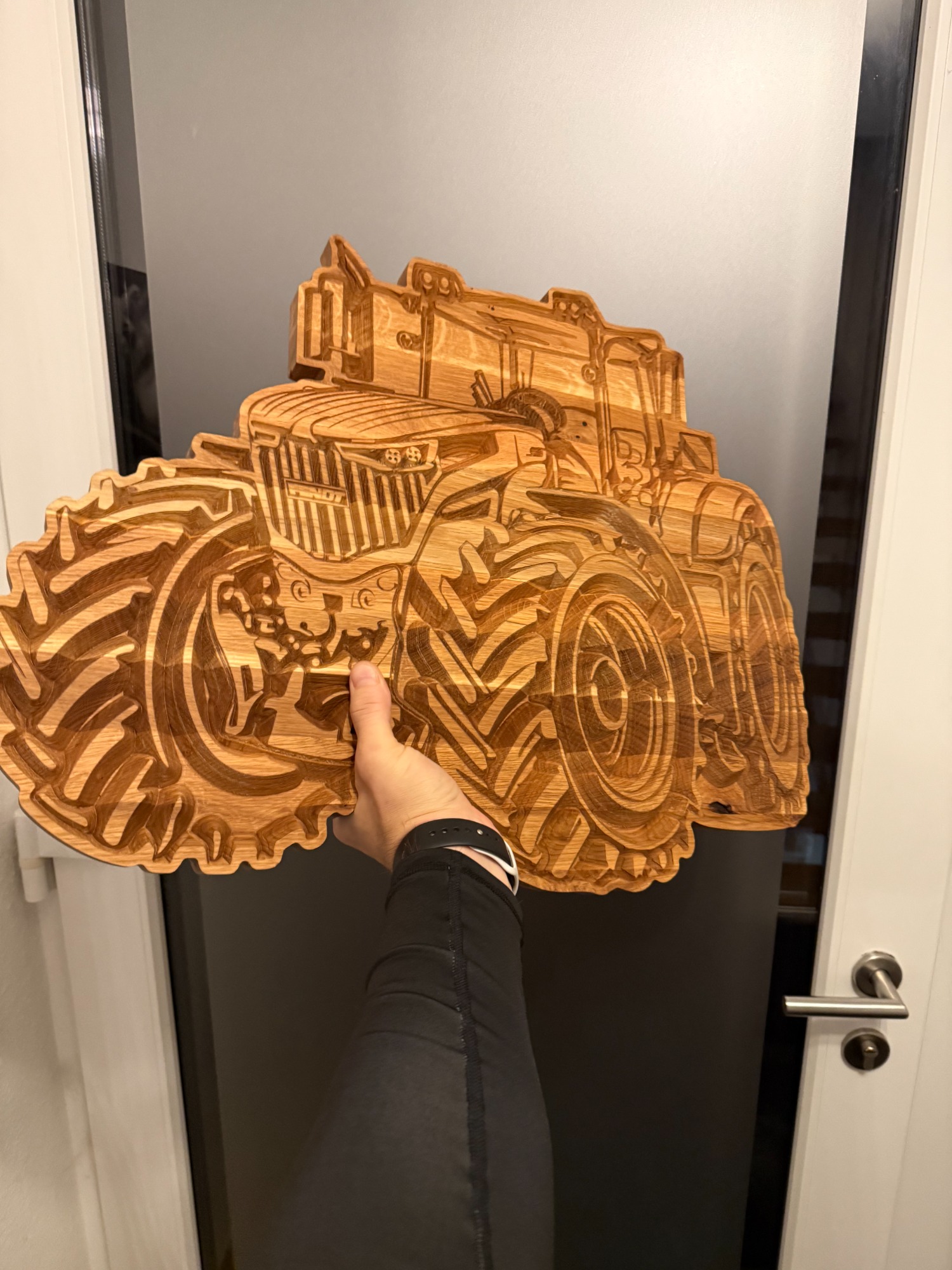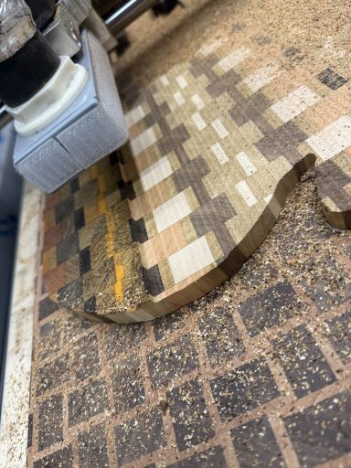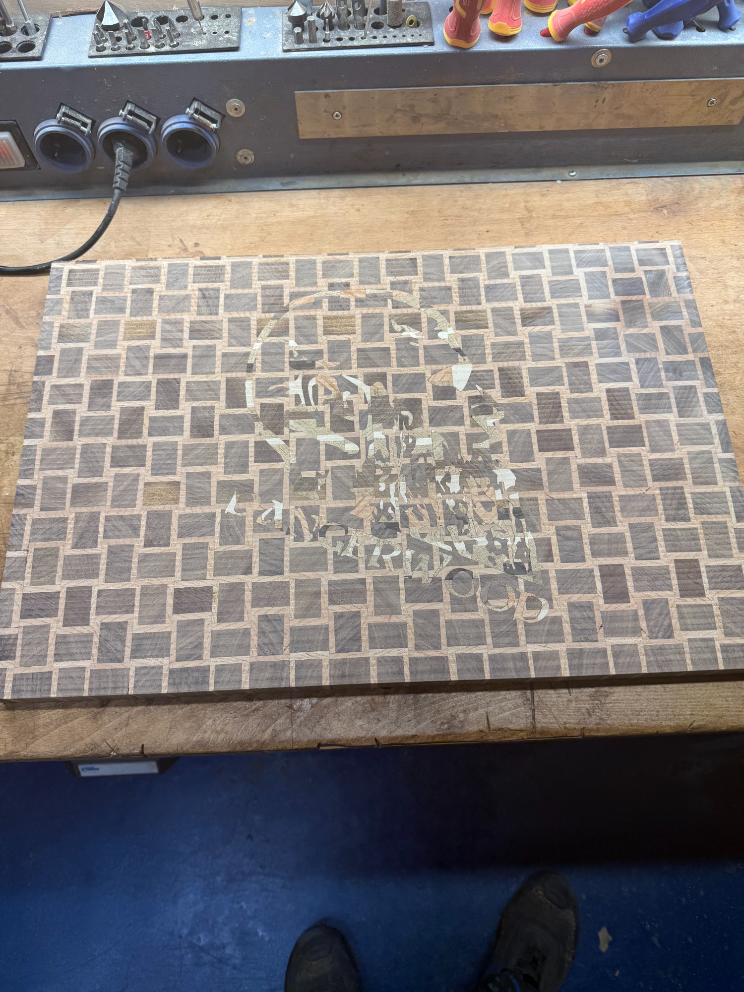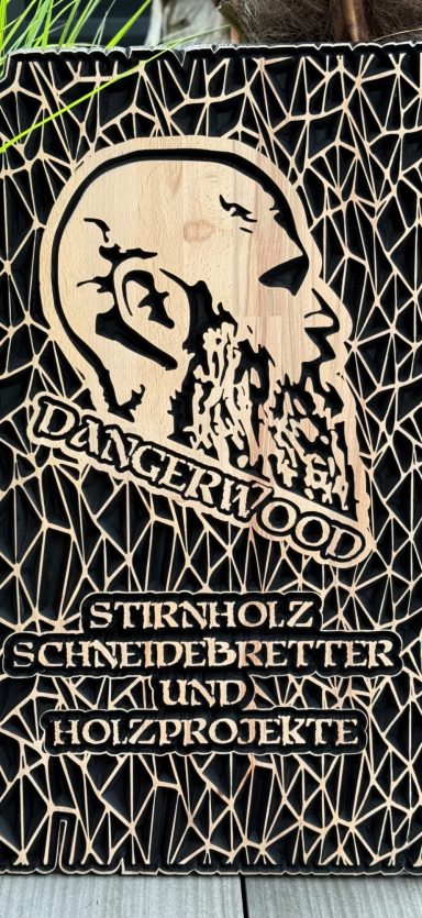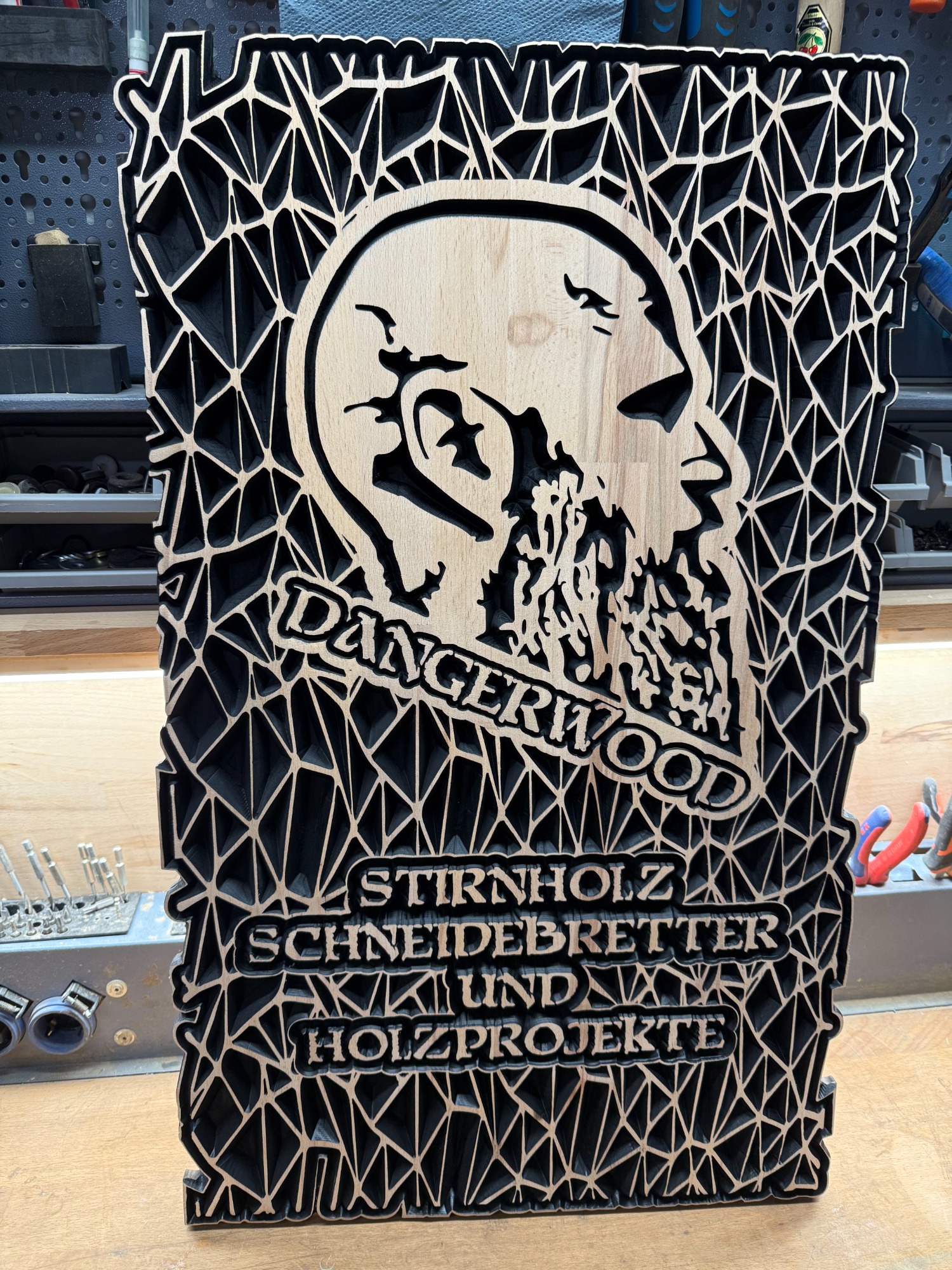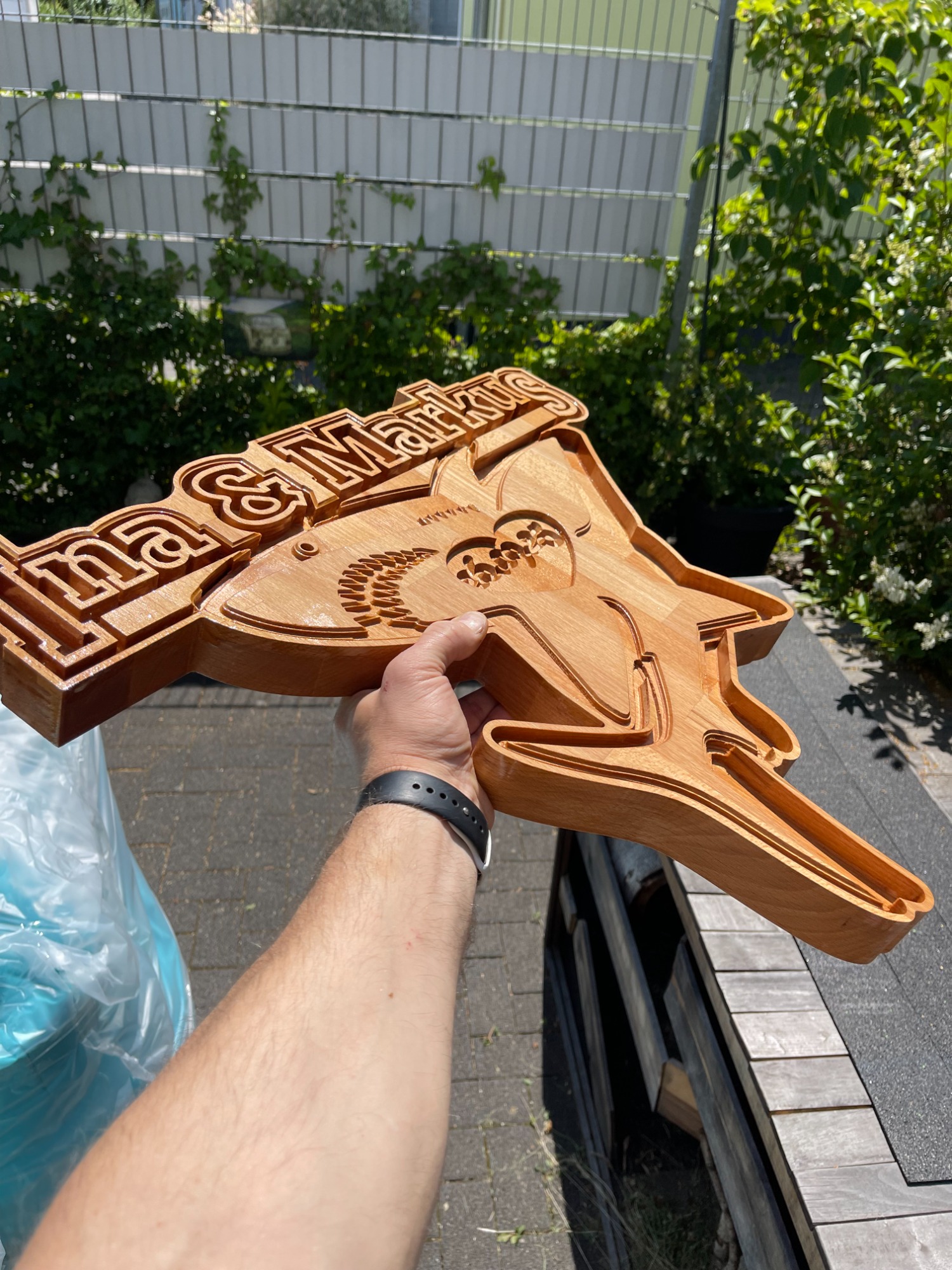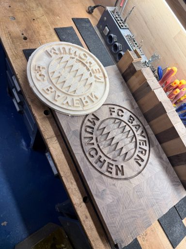 Die Grundidee ist, zum Beispiel eines dieser schönen Schneidbretter mit einem ausgefrästen Logo zu versehen. Das passende Gegenstück fräse ich aus einem anderen Schneidebrett, das schöne Kontrastfarben aufweist. Durch die Fräse wird alles auf 0,1 mm genau gearbeitet – so zumindest mein Plan! ;-)
