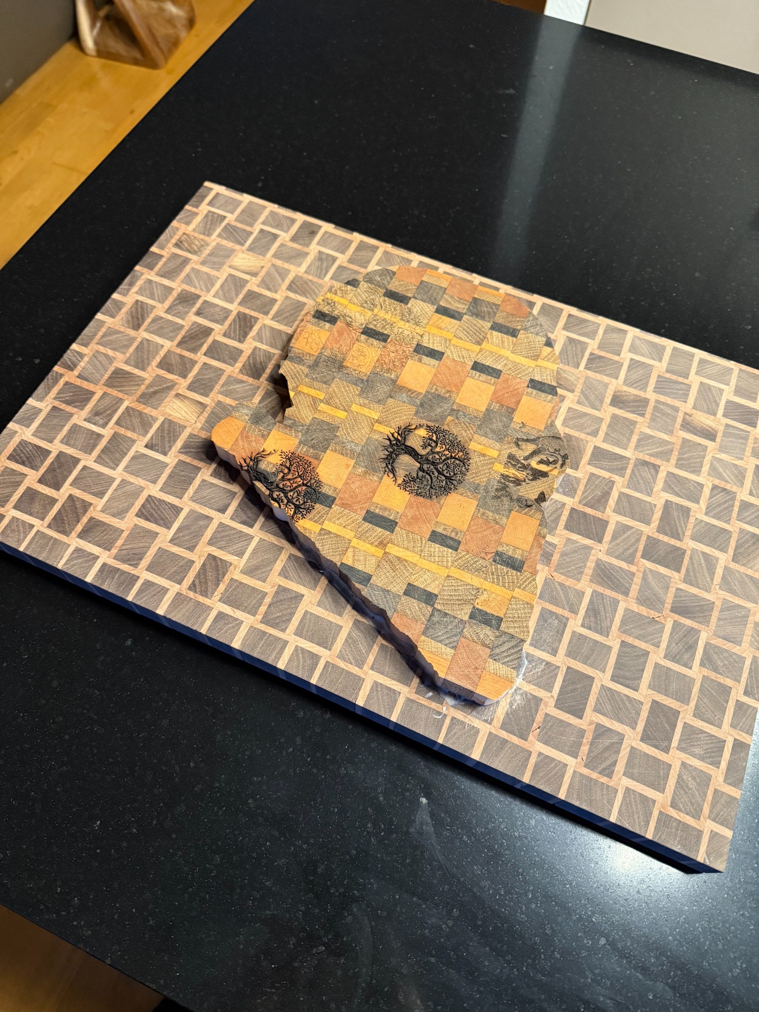 Seit meinem ersten Stirnholzschneidebrett bin ich begeistert vom Thema „Intarsien“. Ich habe viel Erfahrung gesammelt und bin jetzt bereit für ein Upgrade.
