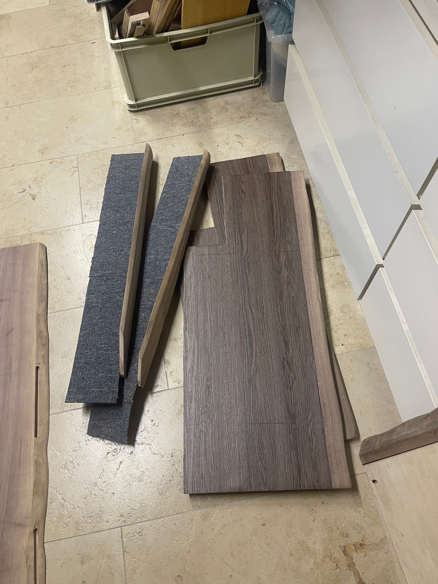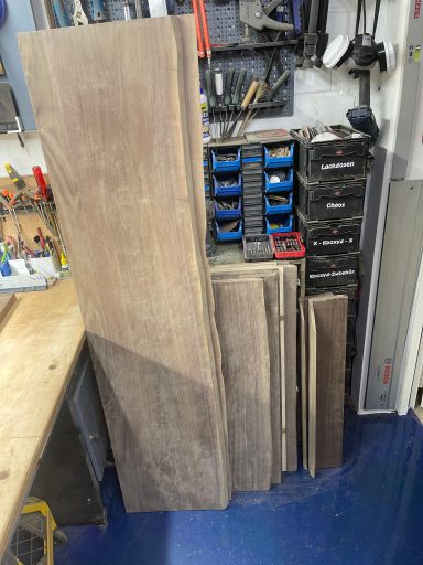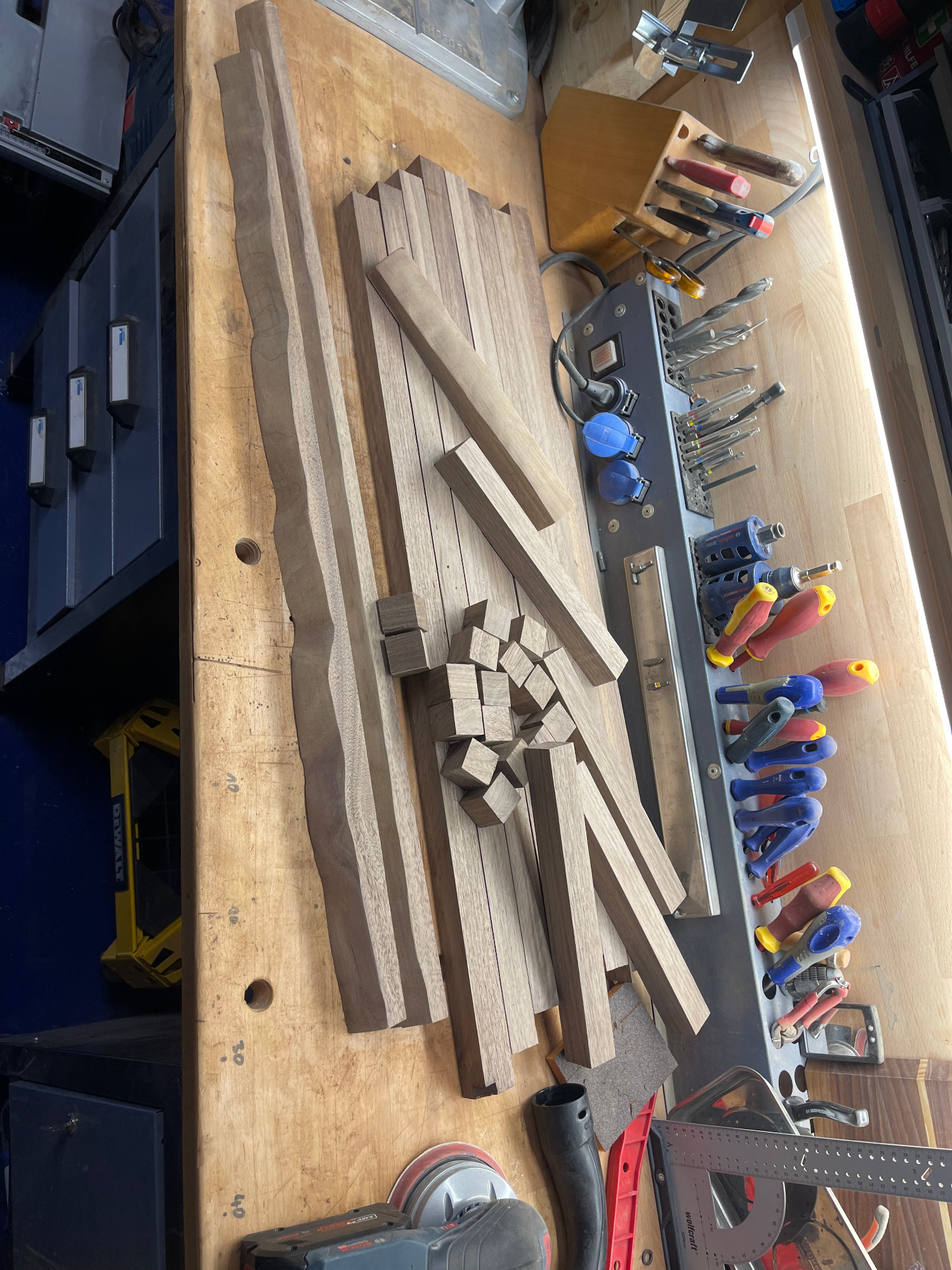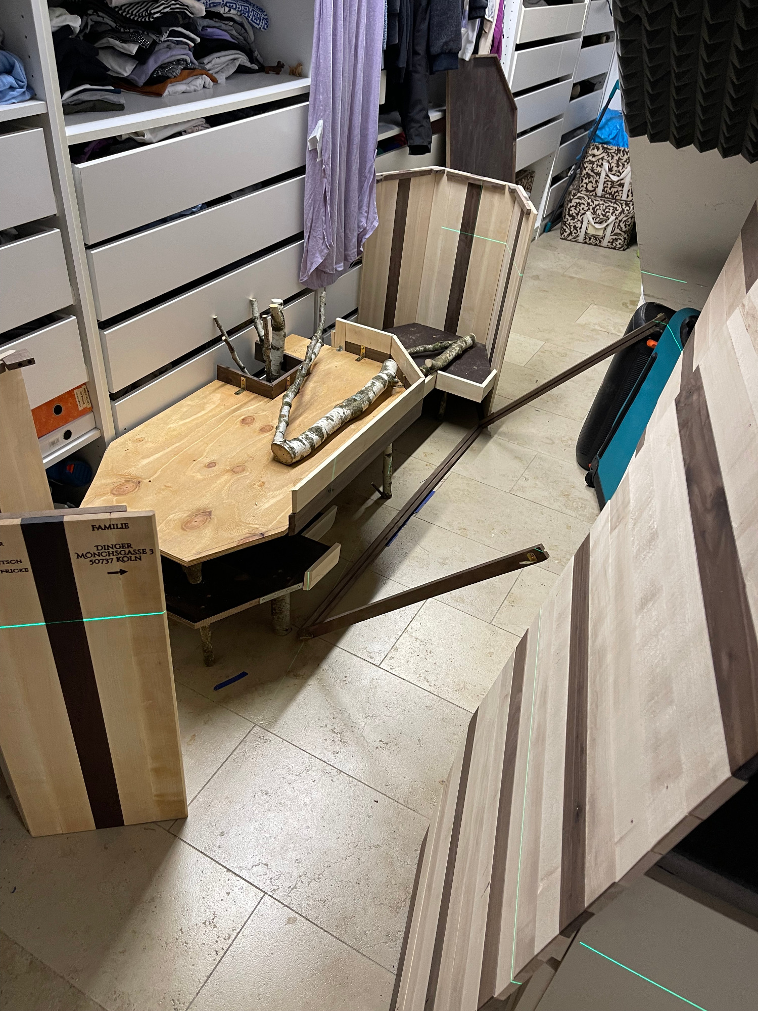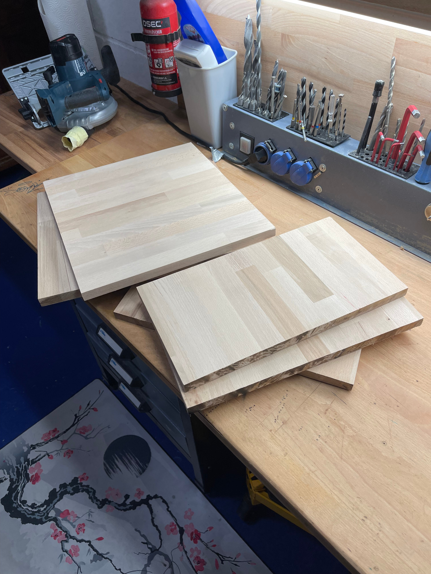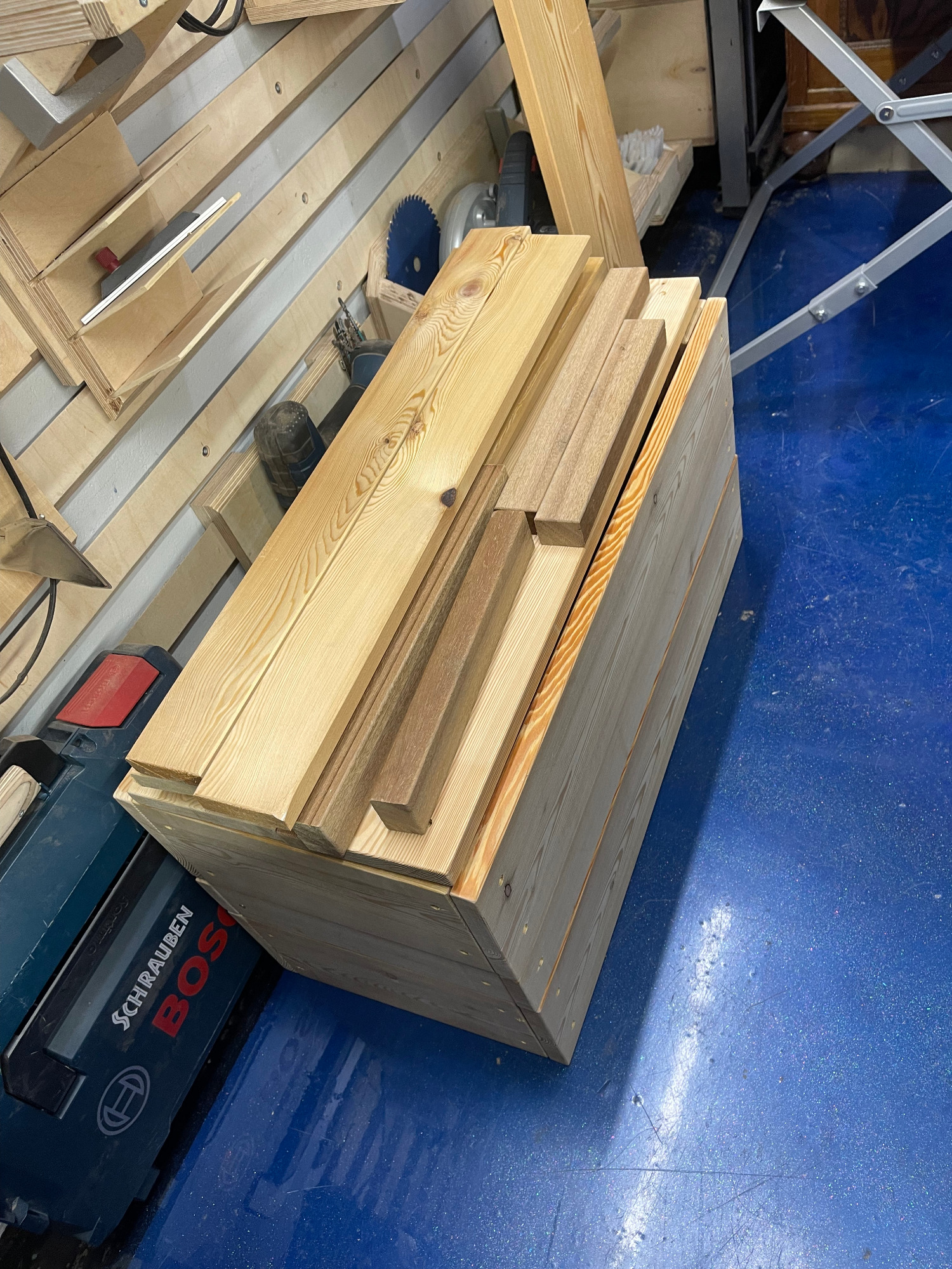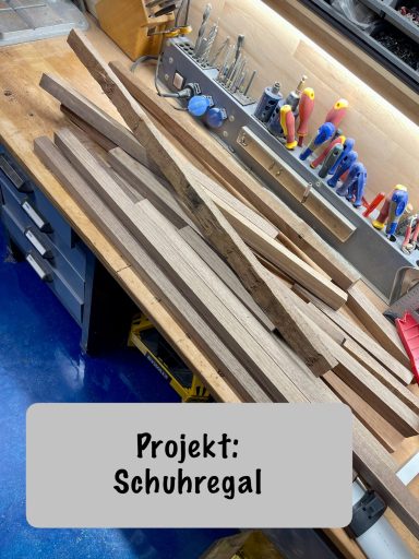 Aufgrund des Verschnitts bleibt viel Holz übrig. Daraus sind bereits verschiedene Projekte entstanden, die ich für mich, Freunde, Bekannte und Verwandte gemacht habe. Dazu gehören unter anderen Schuhregale, Hocker, Holzwandbilder, Tische und Wandregale. Alles wurde aus Massivholz gefertigt. Ich habe das große Glück, in der Nähe einen Edelholz-Großhändler zu haben, was mir ermöglicht, mein Hobby voll auszuleben.
