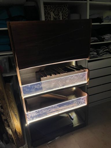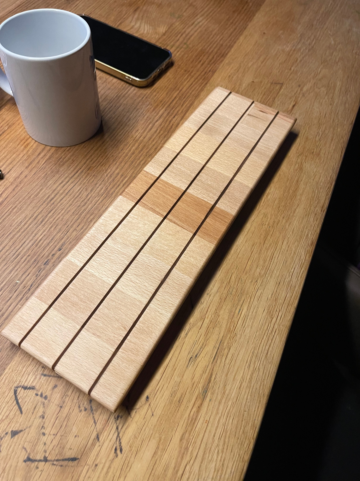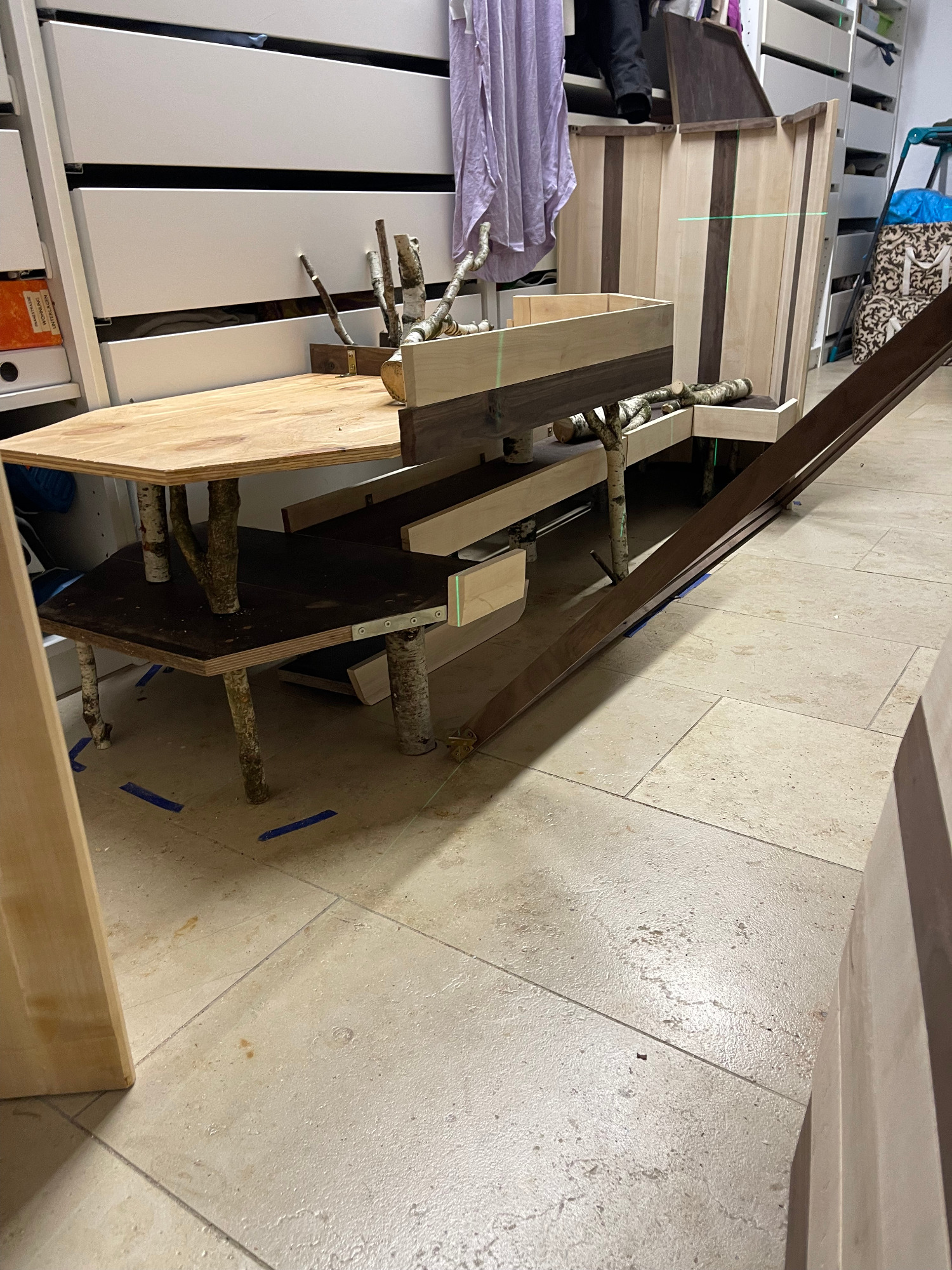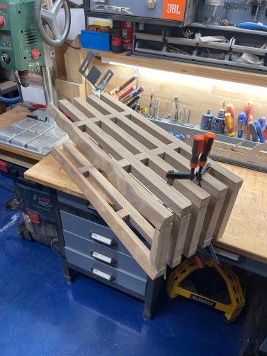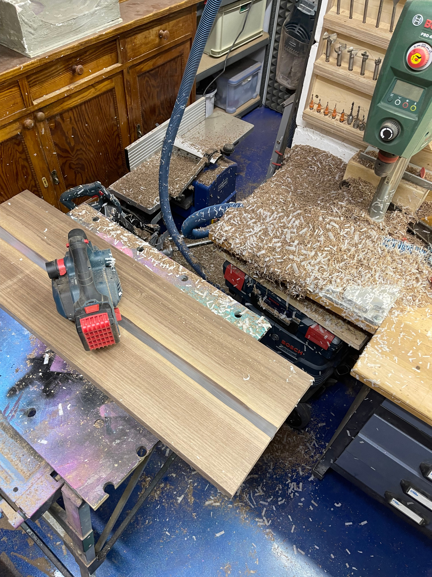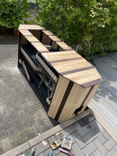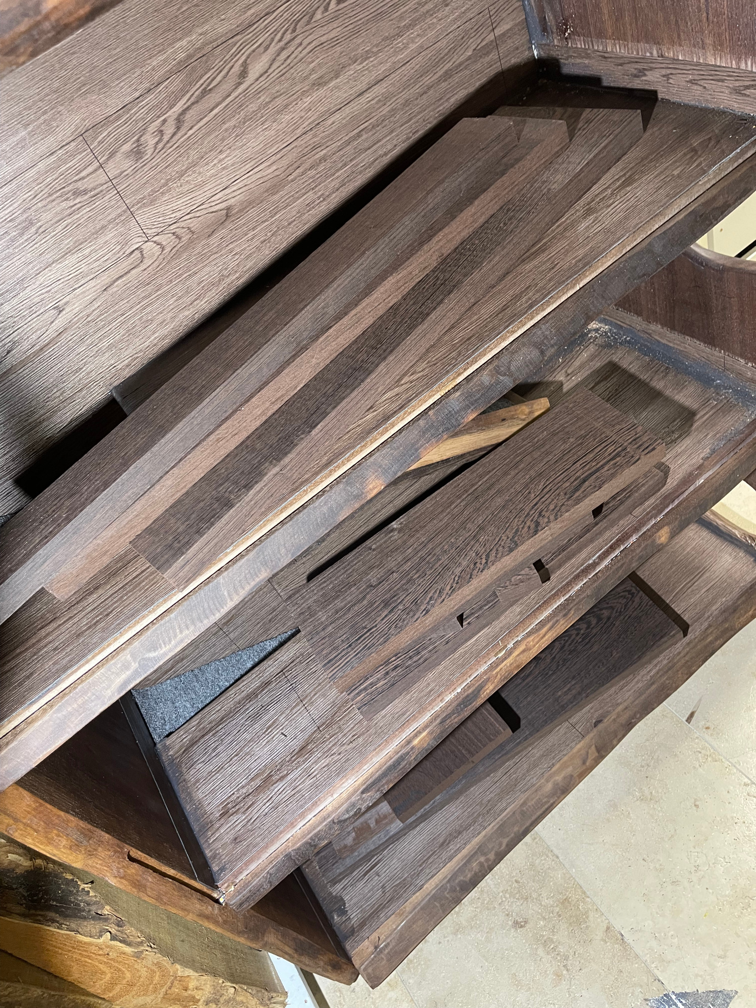 Aufgrund des Verschnitts bleibt viel Holz übrig. Daraus sind bereits verschiedene Projekte entstanden, die ich für mich, Freunde, Bekannte und Verwandte gemacht habe. Dazu gehören unter anderen Schuhregale, Hocker, Holzwandbilder, Tische und Wandregale. Alles wurde aus Massivholz gefertigt. Ich habe das große Glück, in der Nähe einen Edelholz-Großhändler zu haben, was mir ermöglicht, mein Hobby voll auszuleben.
