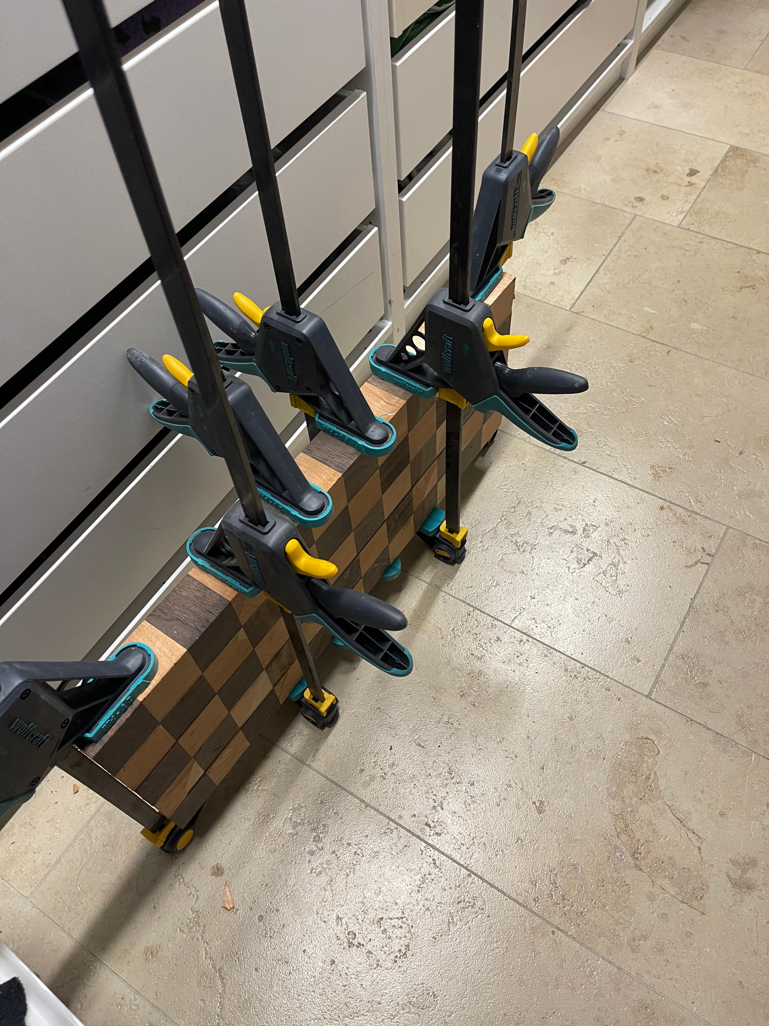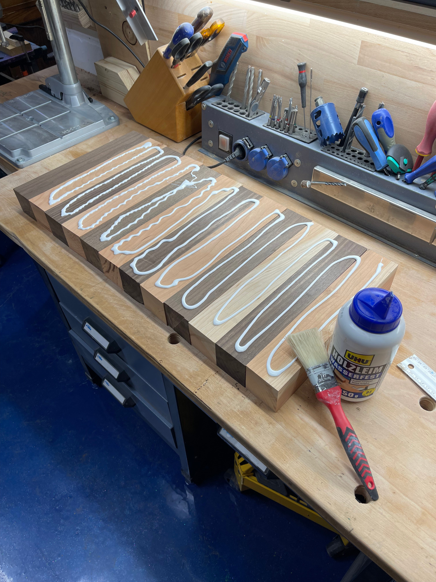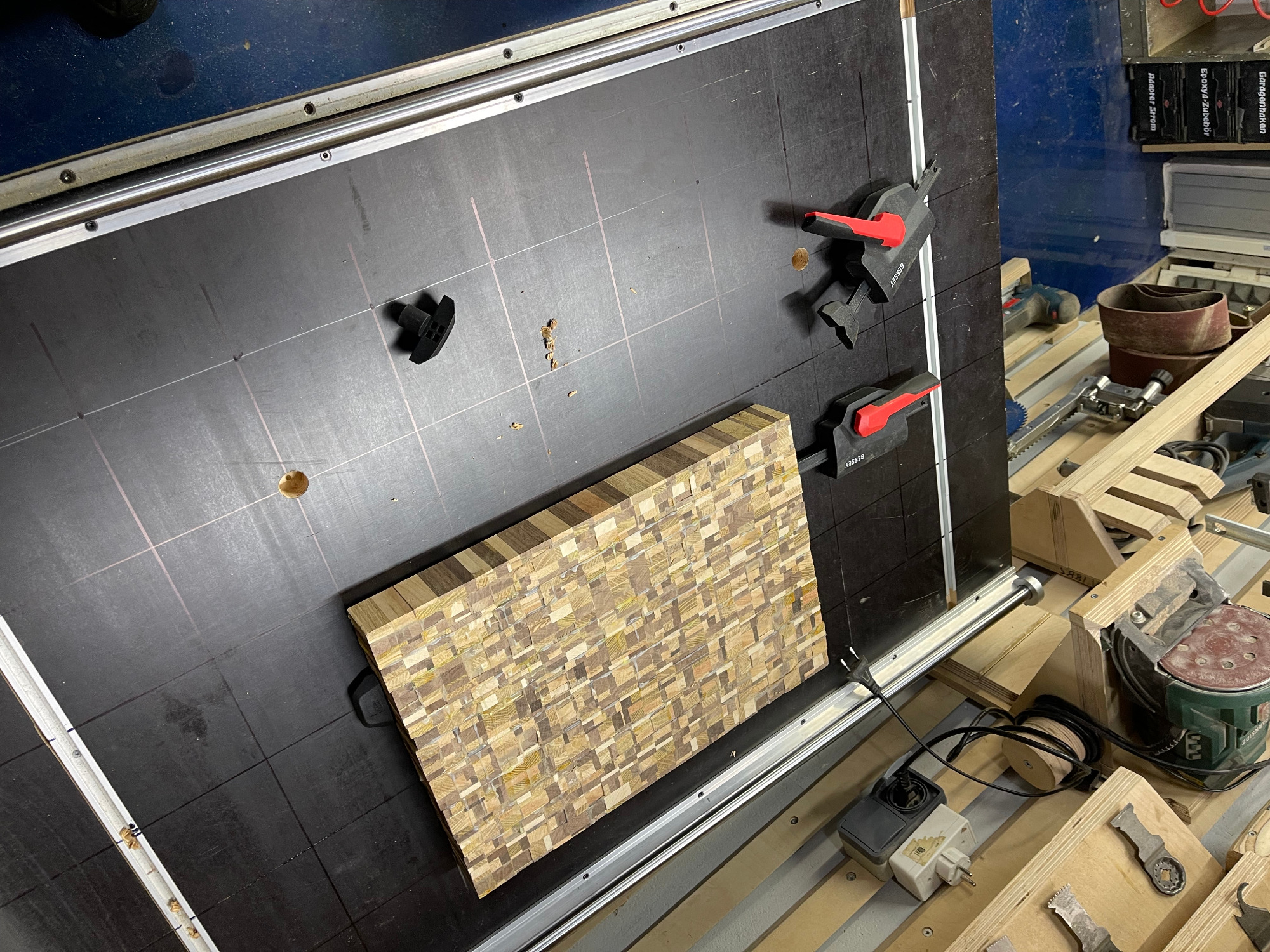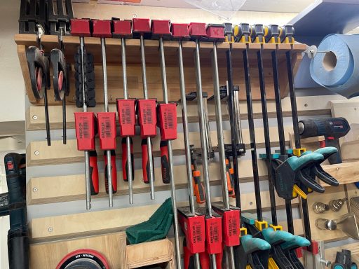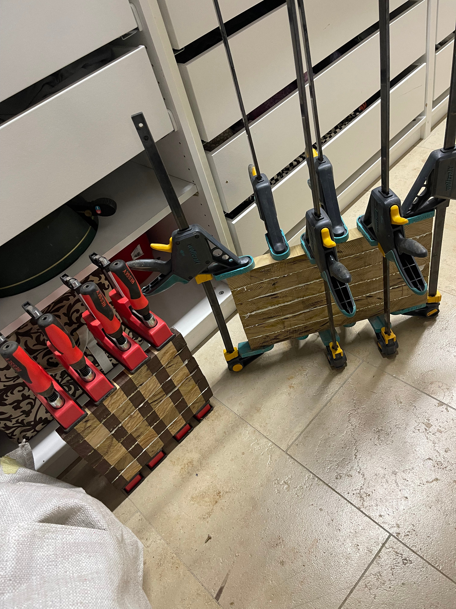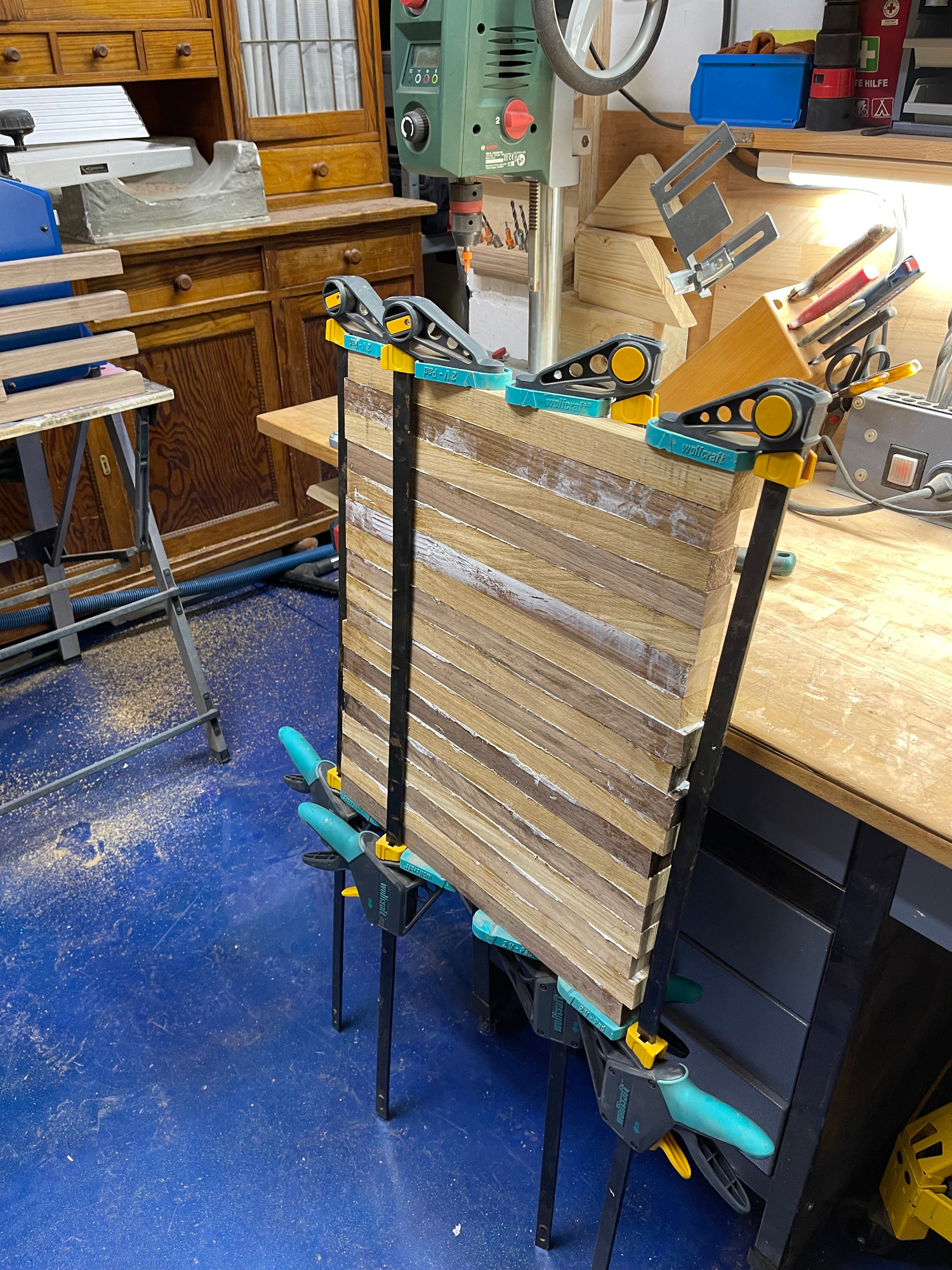 erneut sägen / hobeln / leimen / zwingen