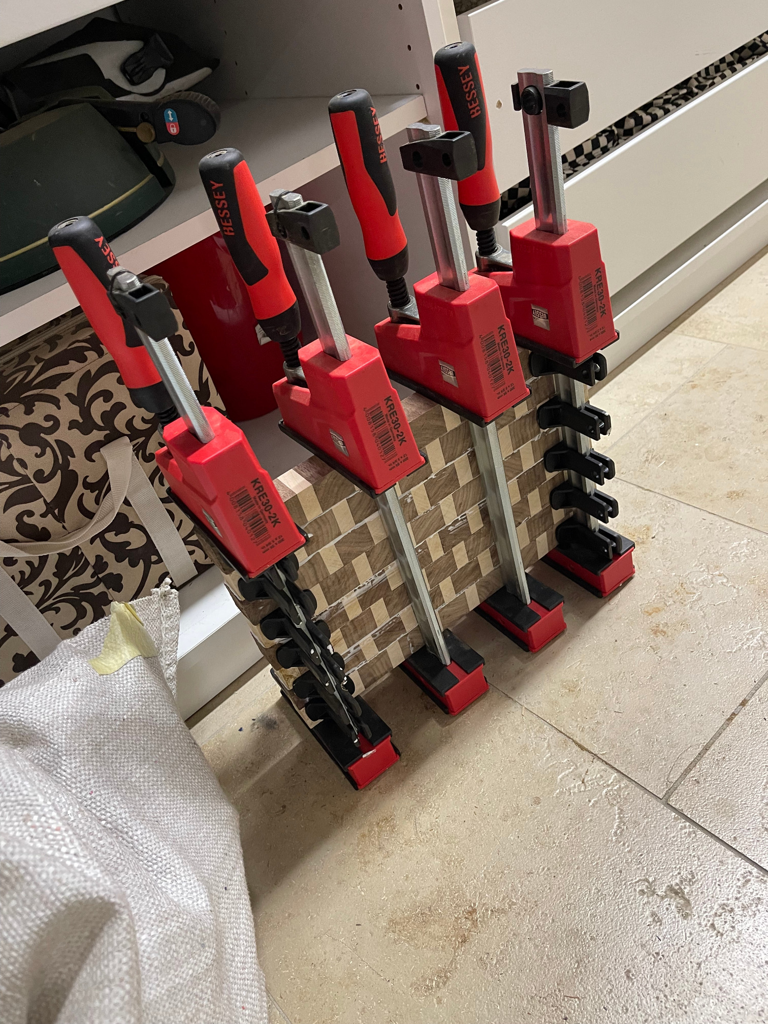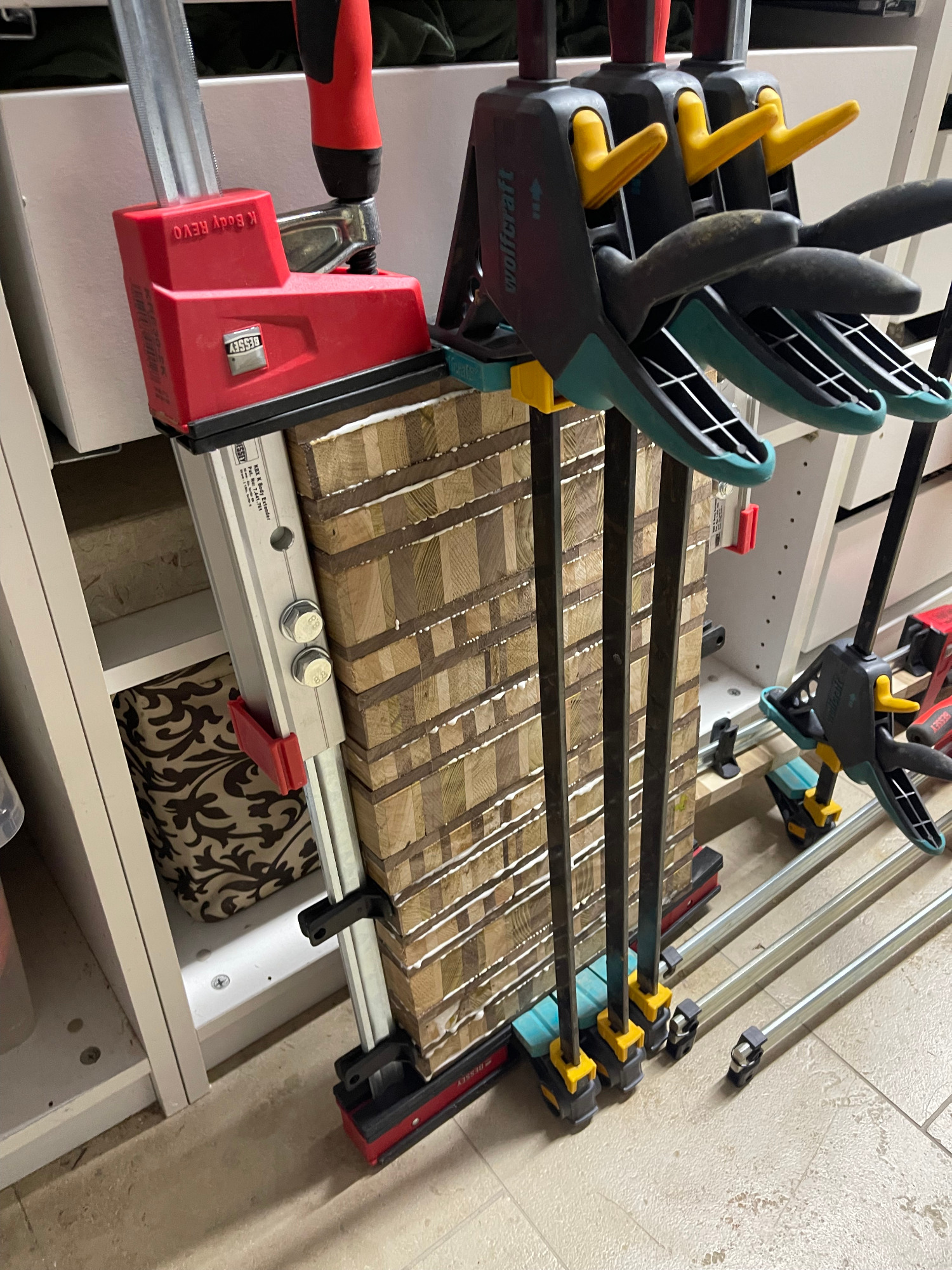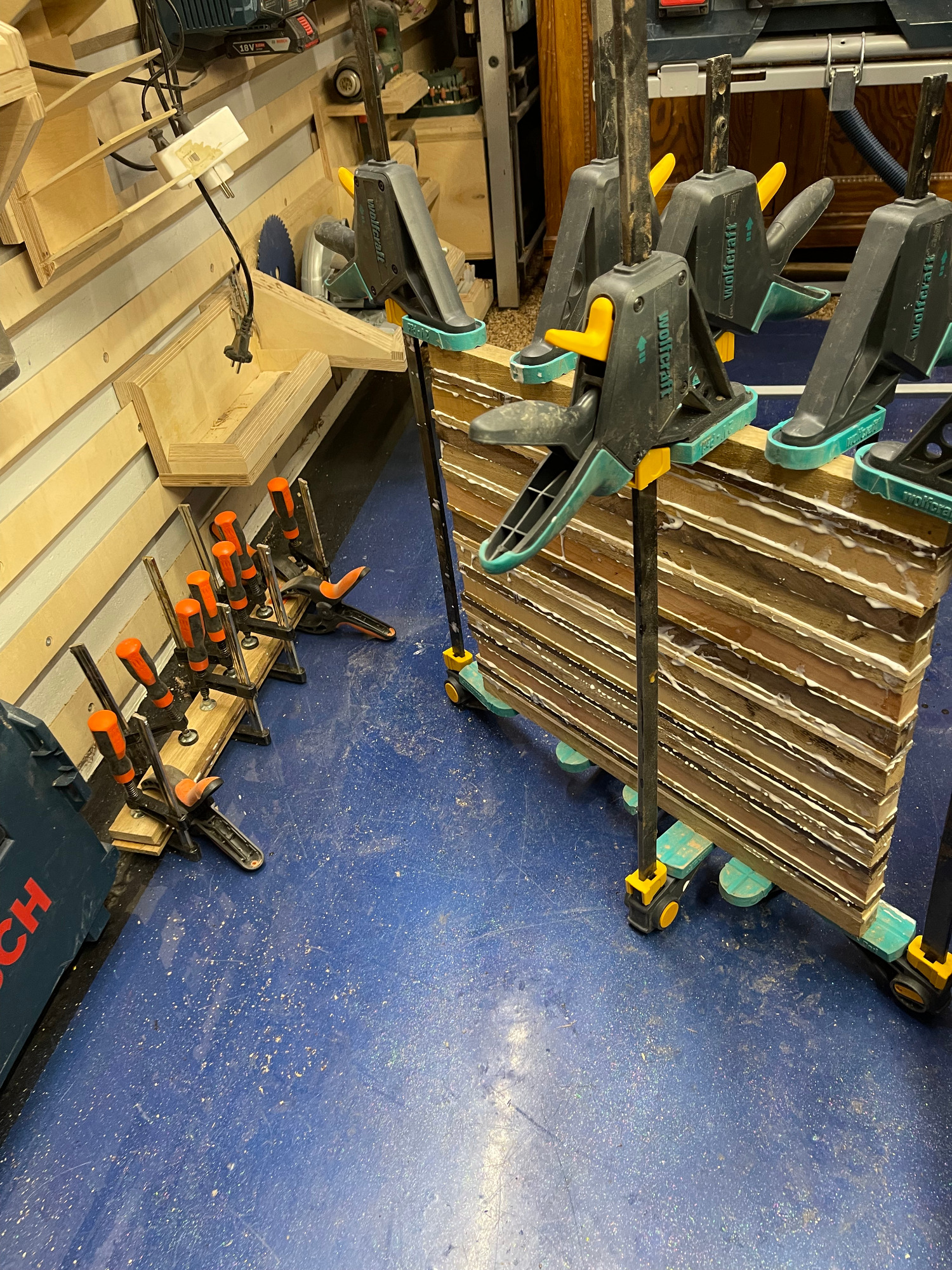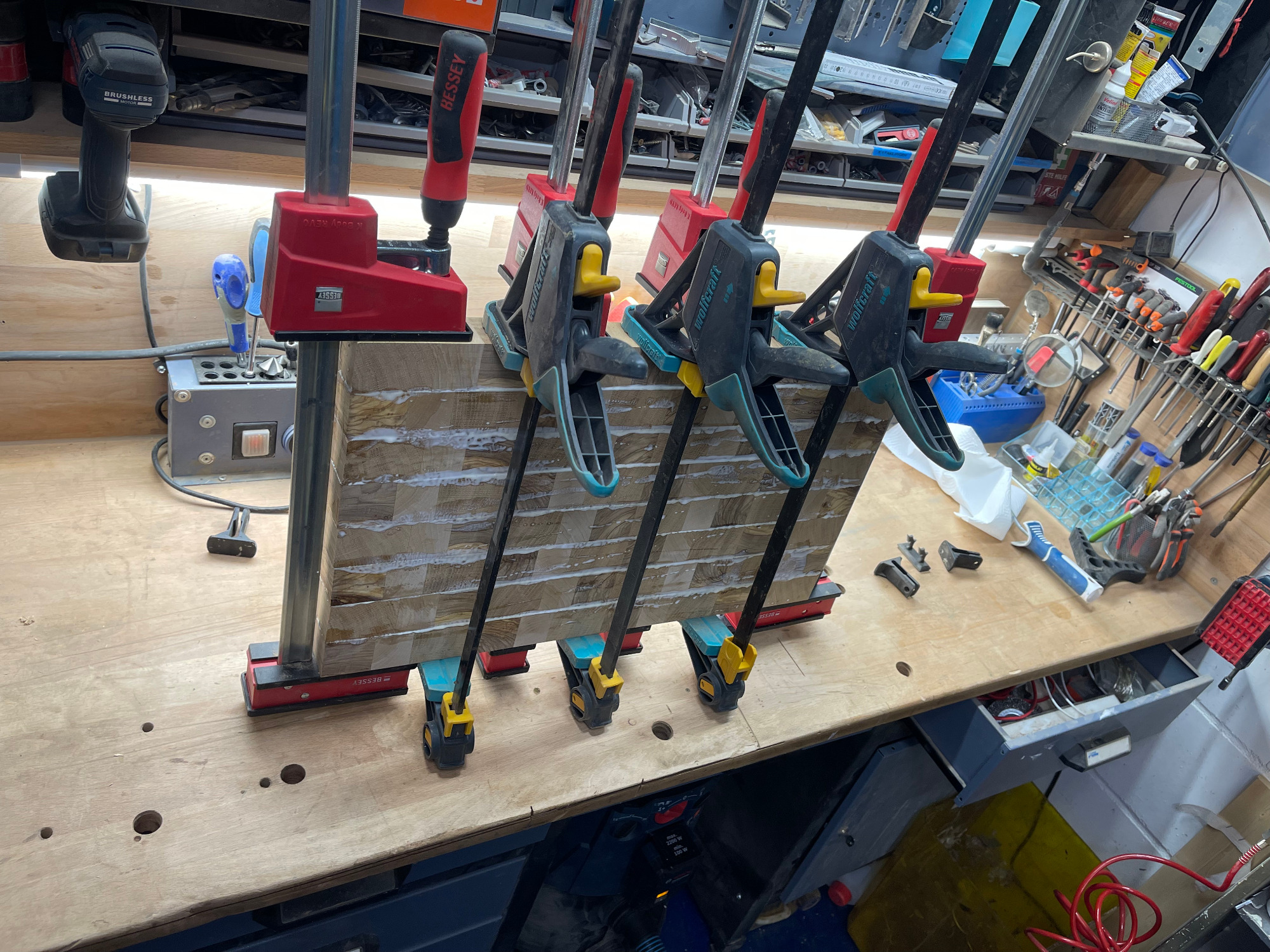 erneut sägen / hobeln / leimen / zwingen