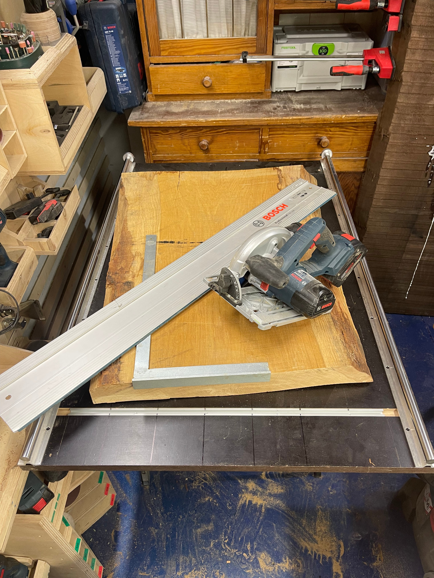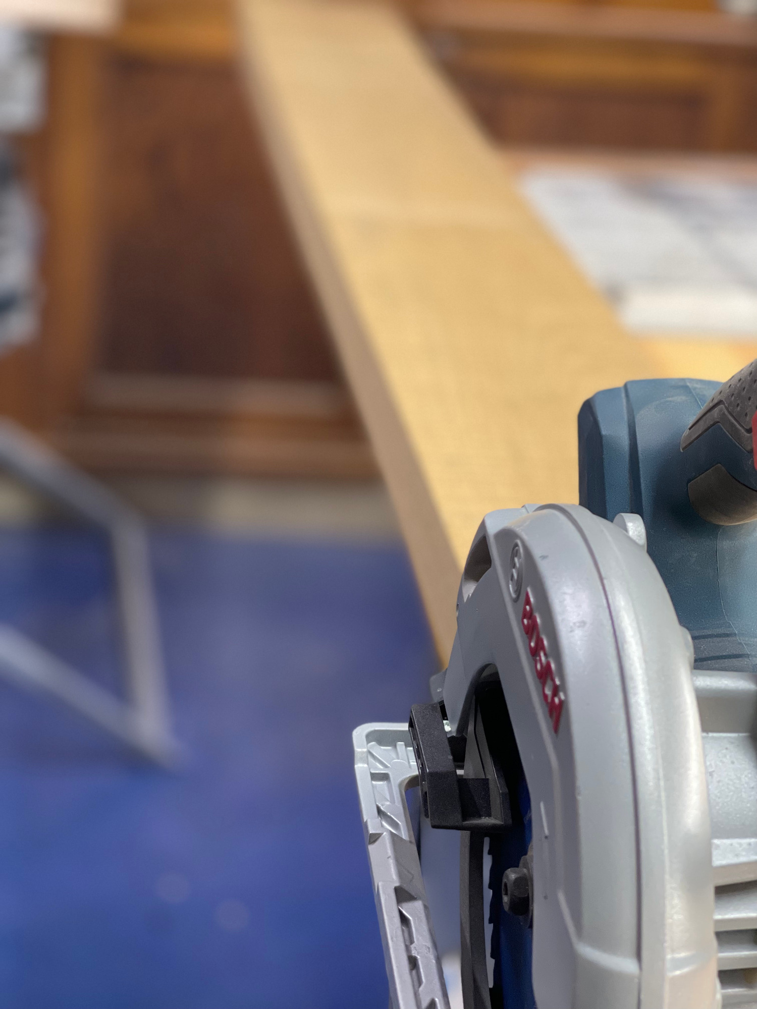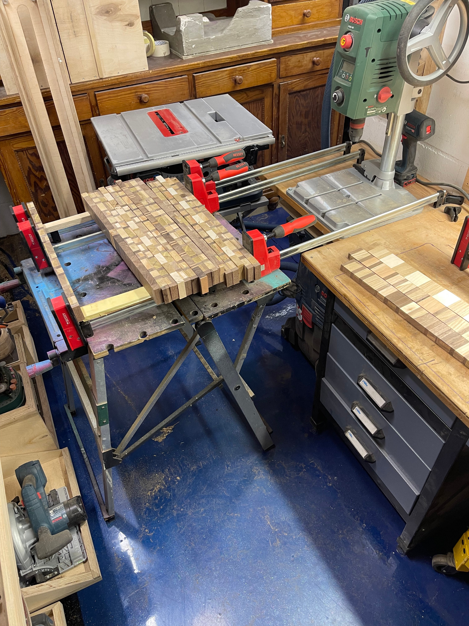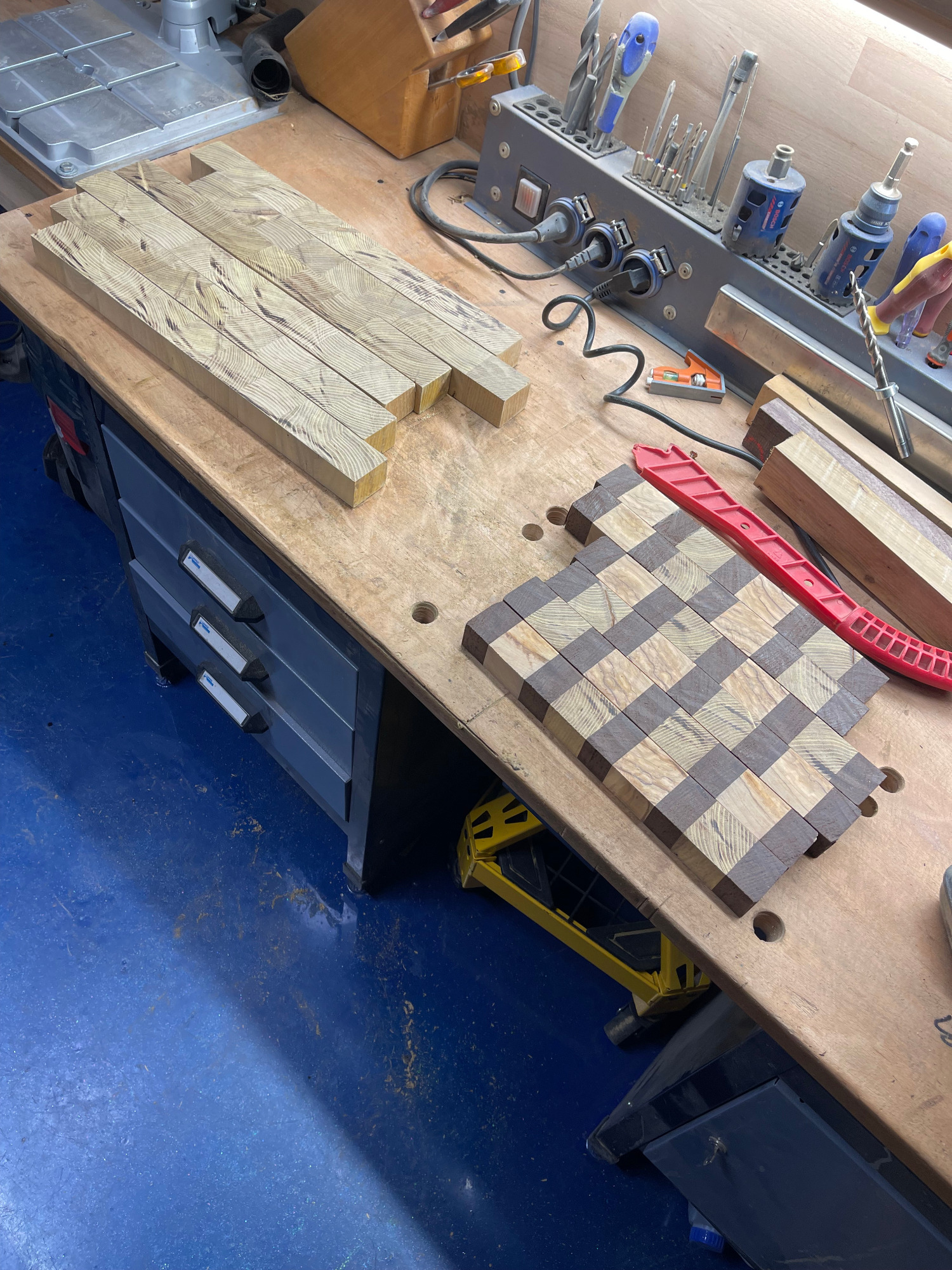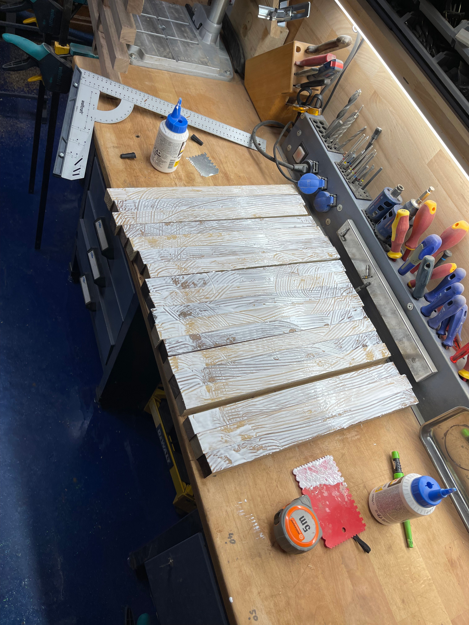 erneut sägen / hobeln / leimen / zwingen
