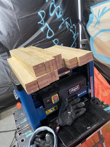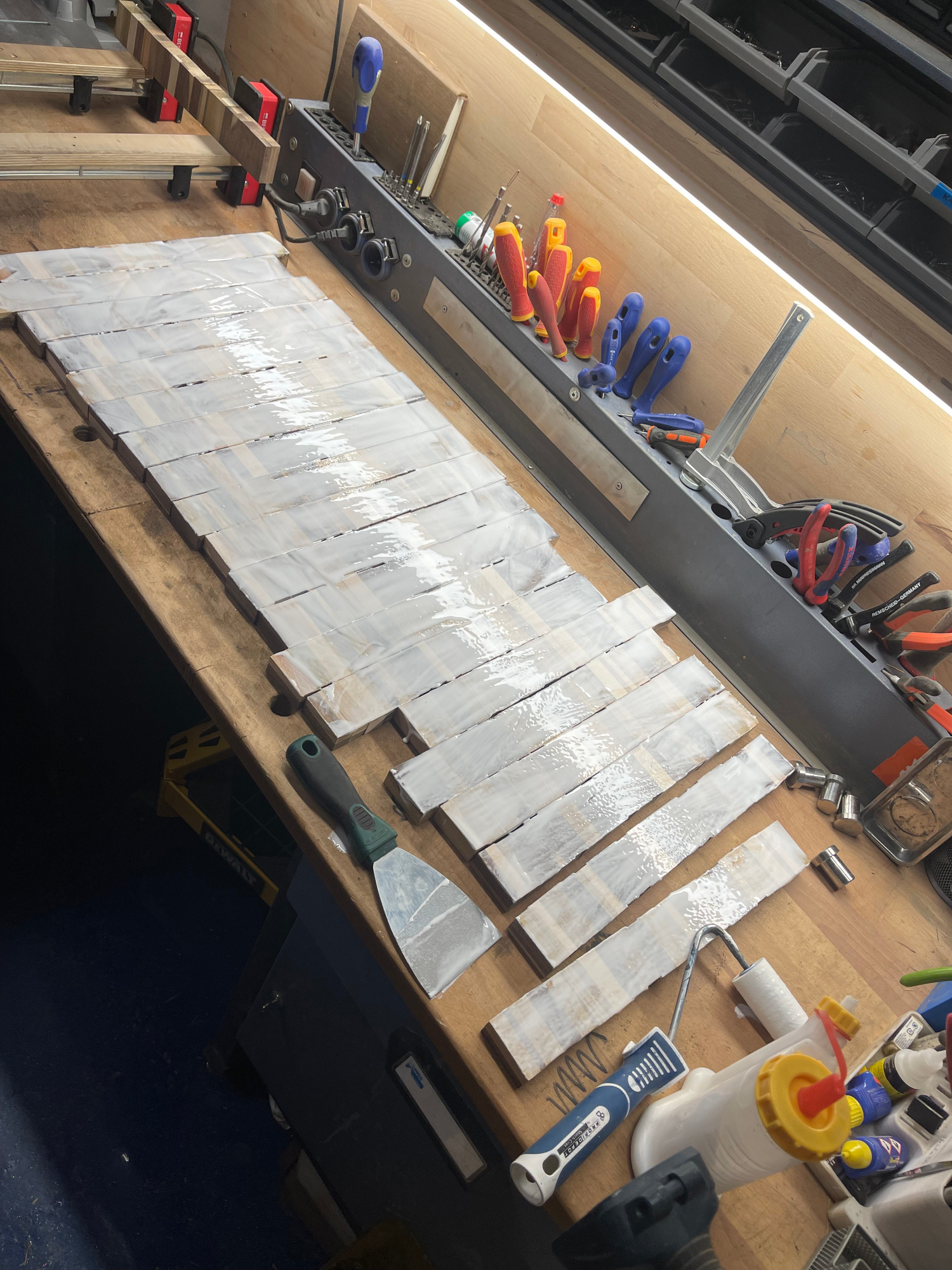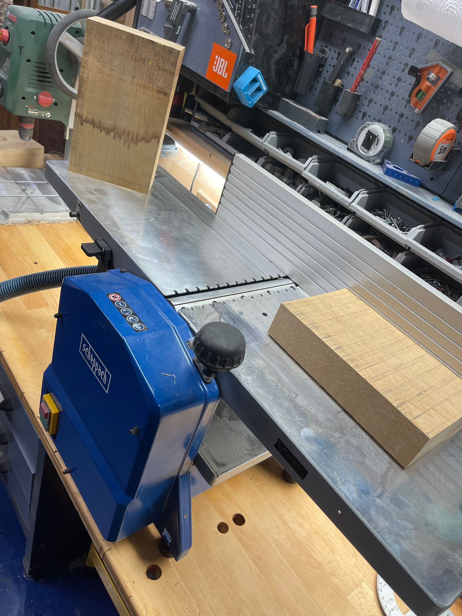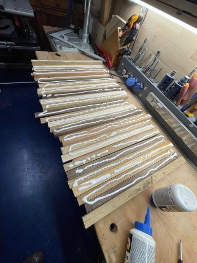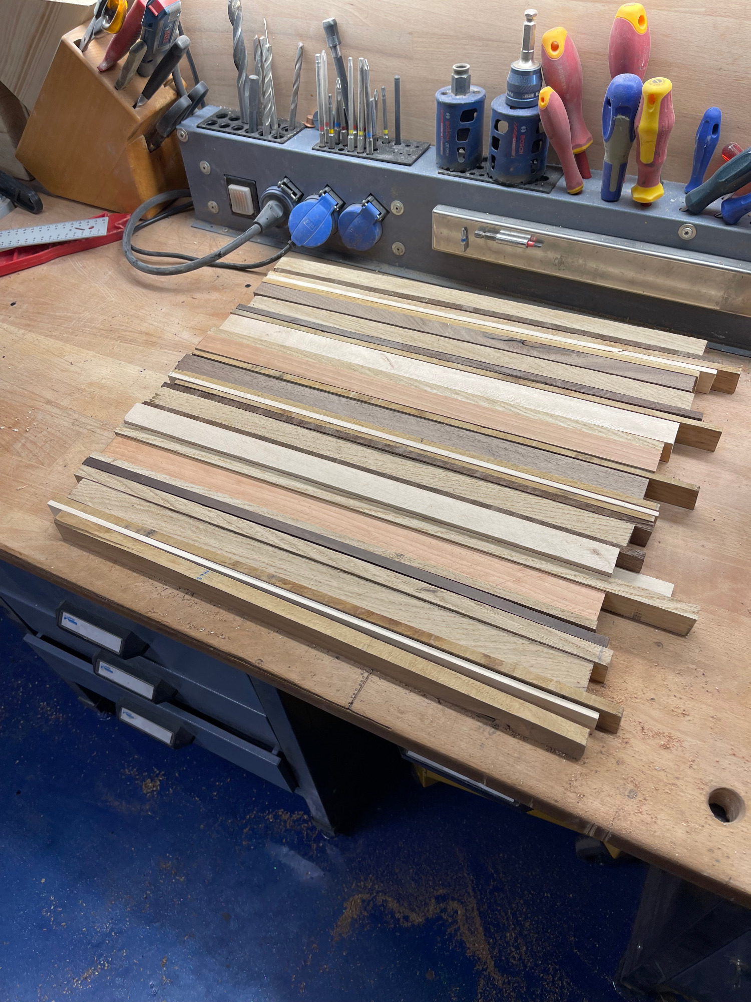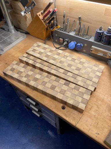 Bohle auftrennen, abrichten, hobeln, sägen, leimen, erneut sägen, erneut leimen, planfräsen, schleifen, kantenfräsen, bohren, schleifen, wässern, schleifen, ölen, schleifen, ölen... und dazwischen noch viele kleine Schritte. Viel Arbeit, aber es macht mir irgendwie Spaß! :-)
