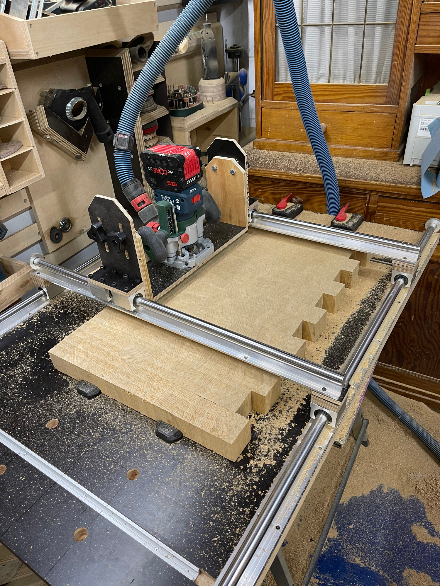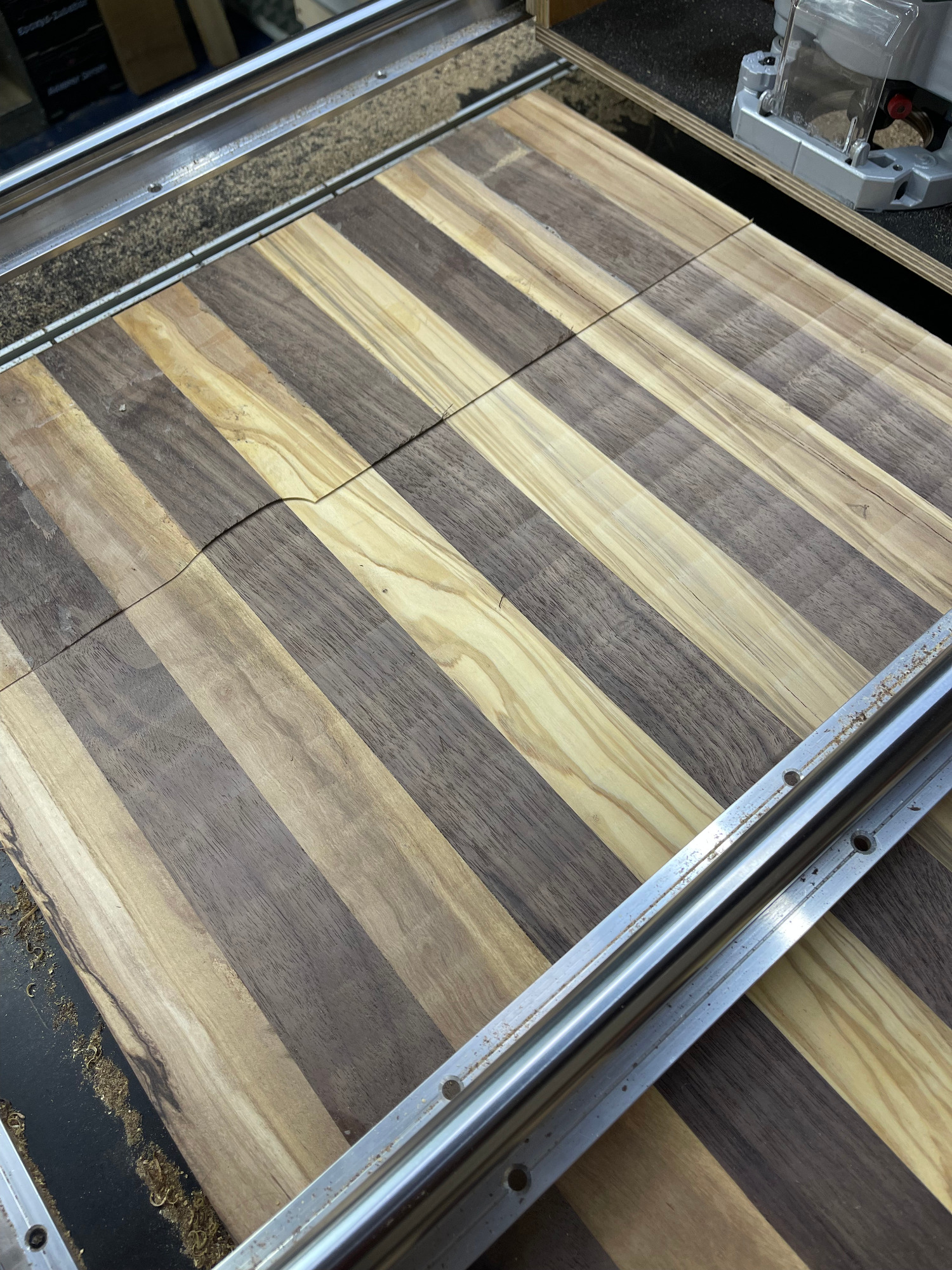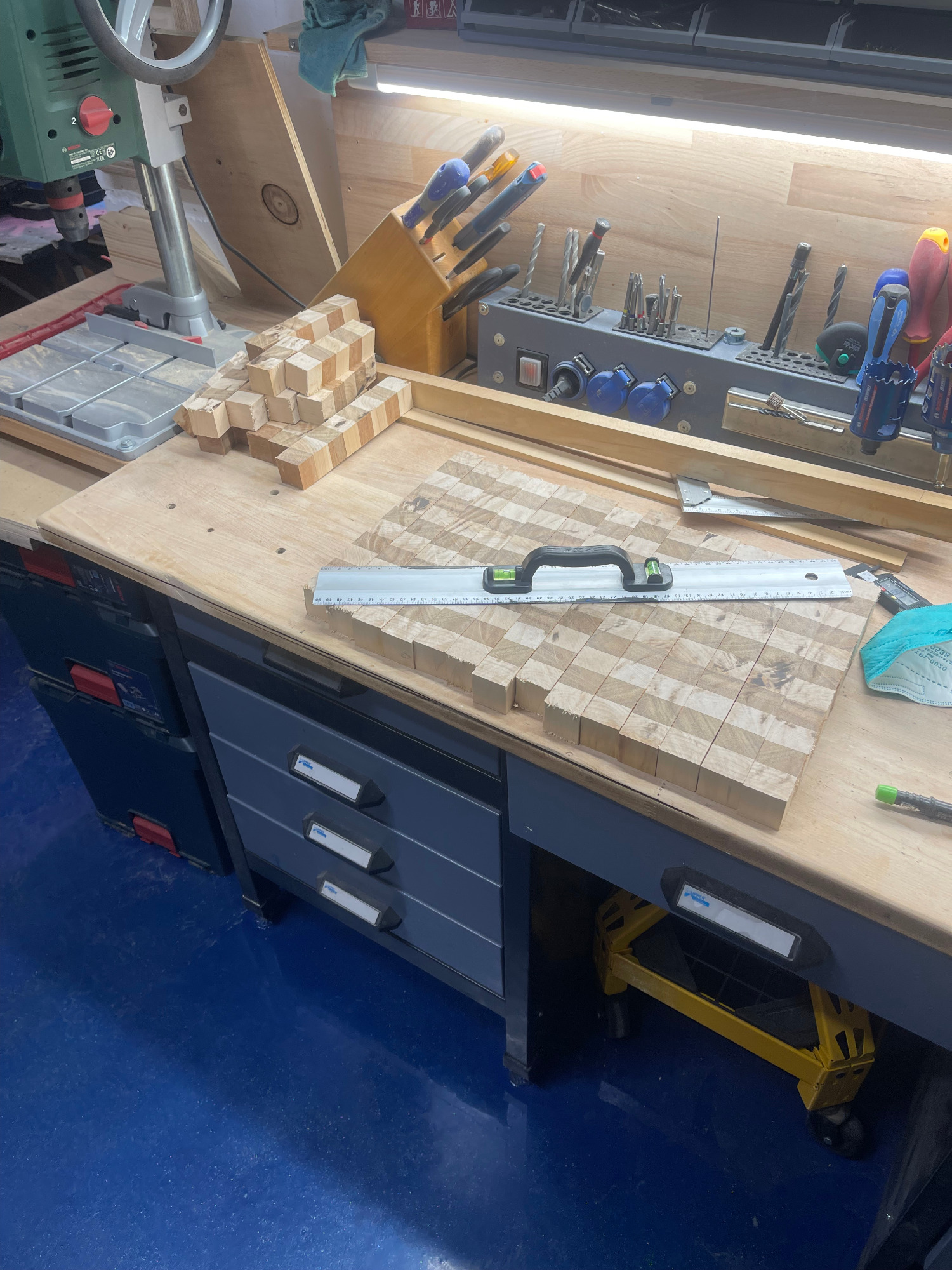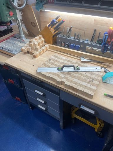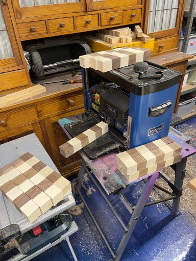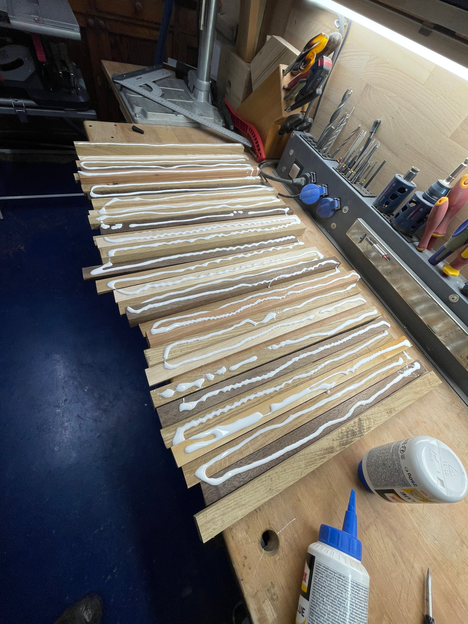 Bohle auftrennen, abrichten, hobeln, sägen, leimen, erneut sägen, erneut leimen, planfräsen, schleifen, kantenfräsen, bohren, schleifen, wässern, schleifen, ölen, schleifen, ölen... und dazwischen noch viele kleine Schritte. Viel Arbeit, aber es macht mir irgendwie Spaß! :-)